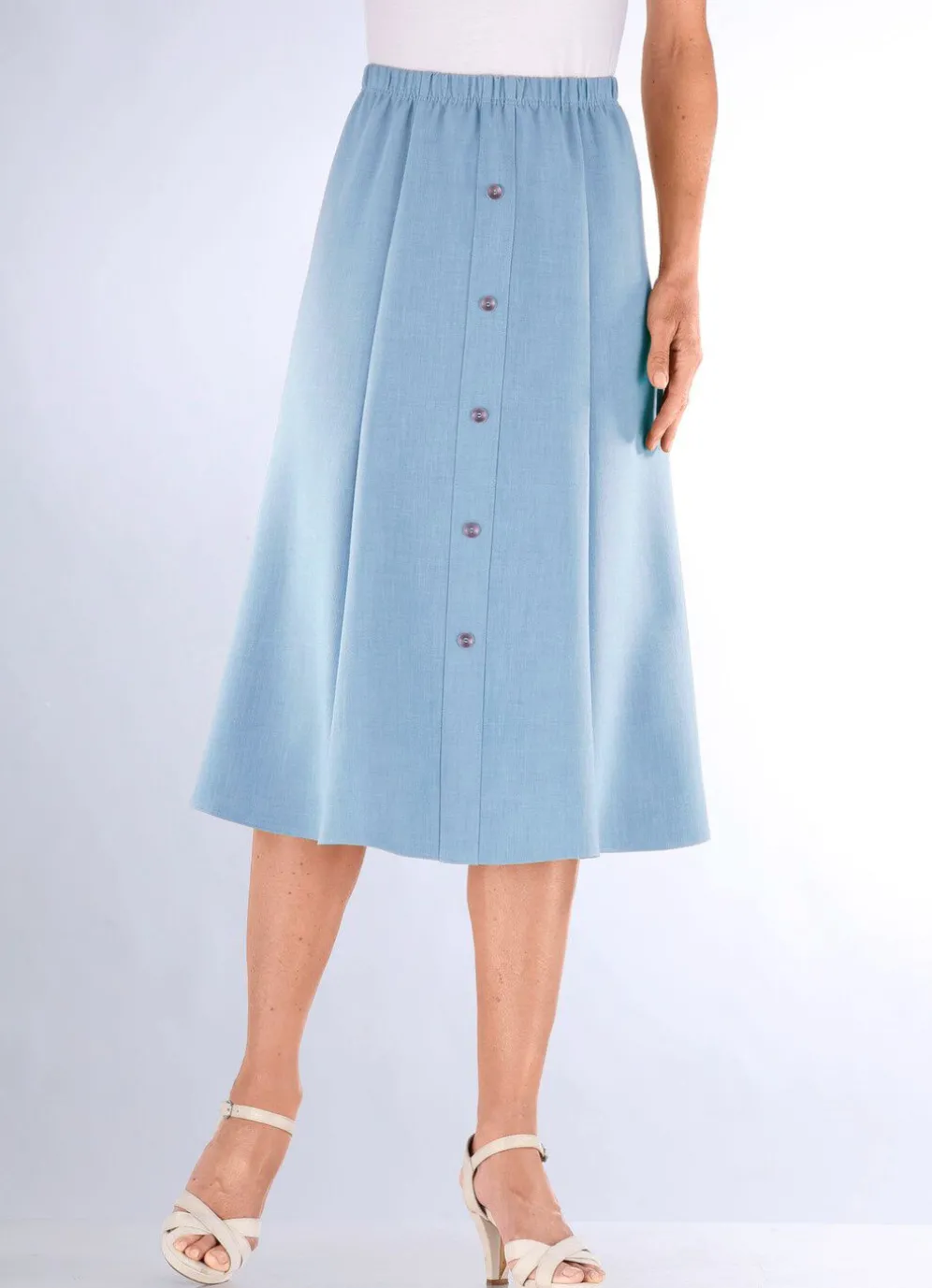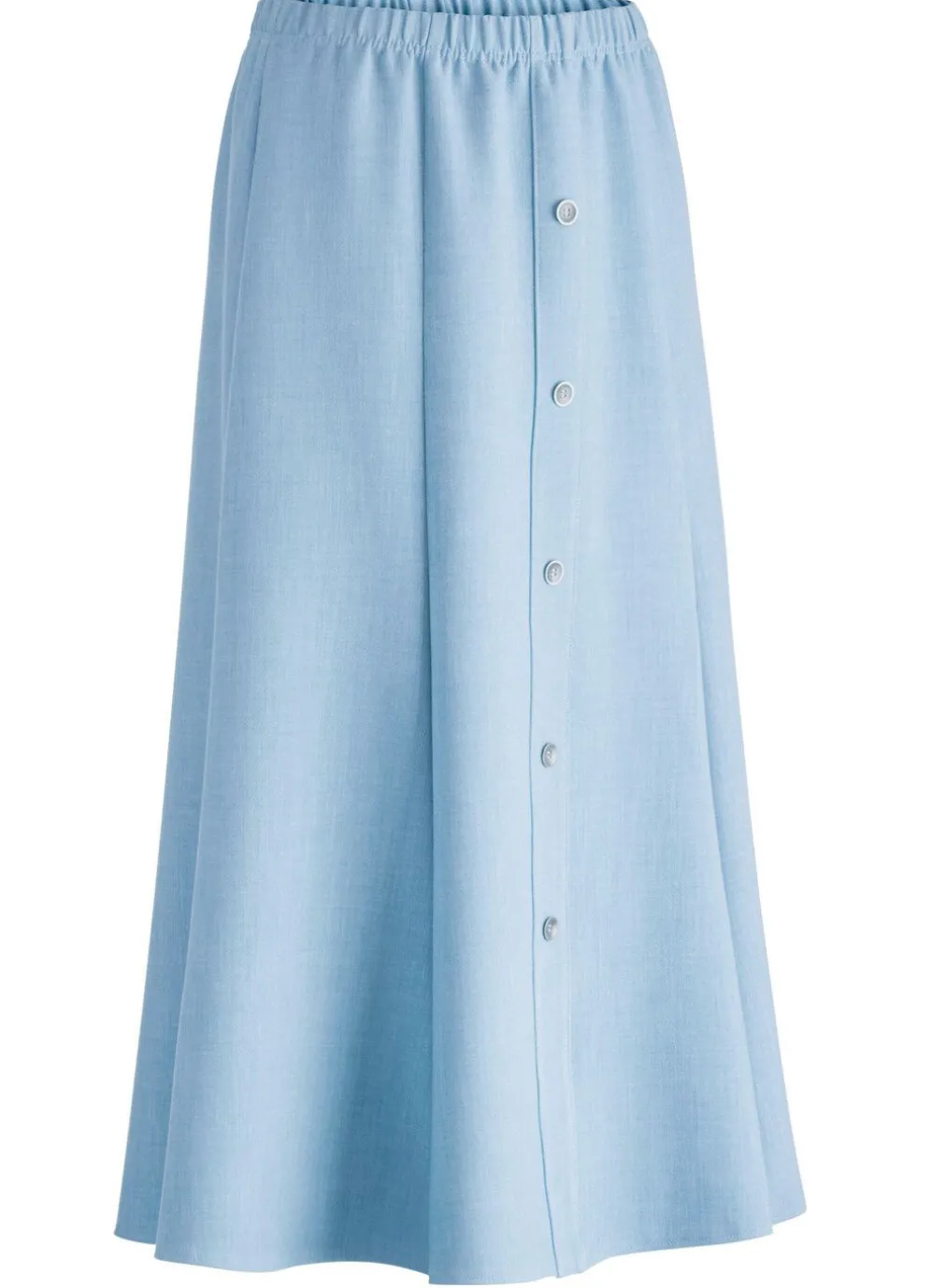 Exzellenter, weich fließender 6-Bahnenrock: leicht ausgestellte, bequeme Schlupfform, schmaler Dehnbund rundum sowie schmückende Zierknopfblende im Vorderteil. Länge ab Taille ca. 75 cm, bei K-Gr. ca. 69 cm.