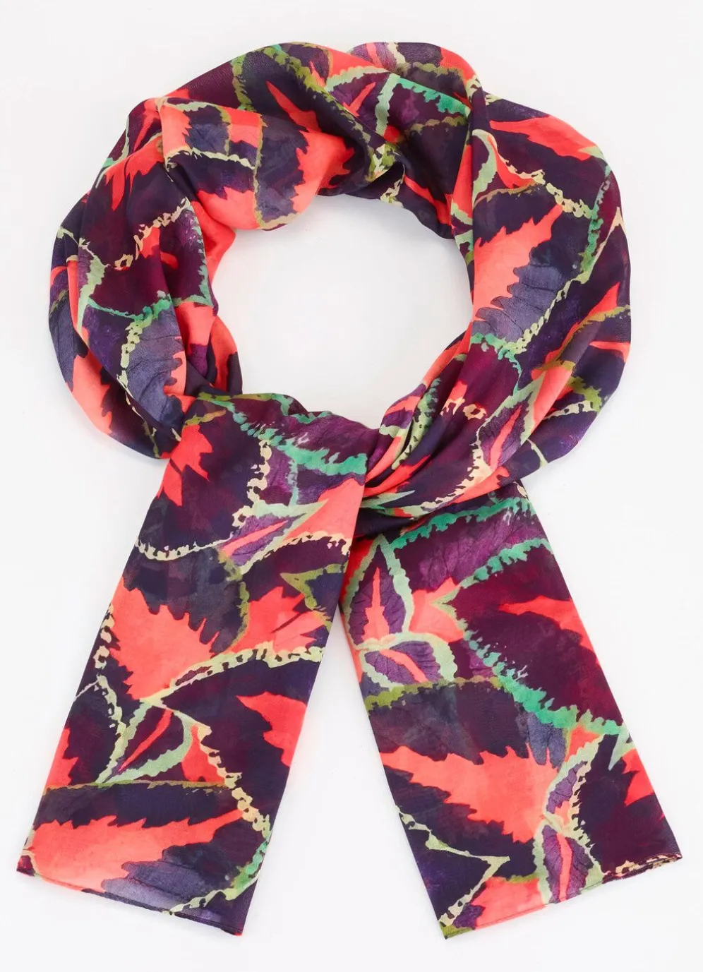 Ansprechender Schal mit Fantasiedessin in Signalrot-Grün auf pflaumefarbenem Grund.