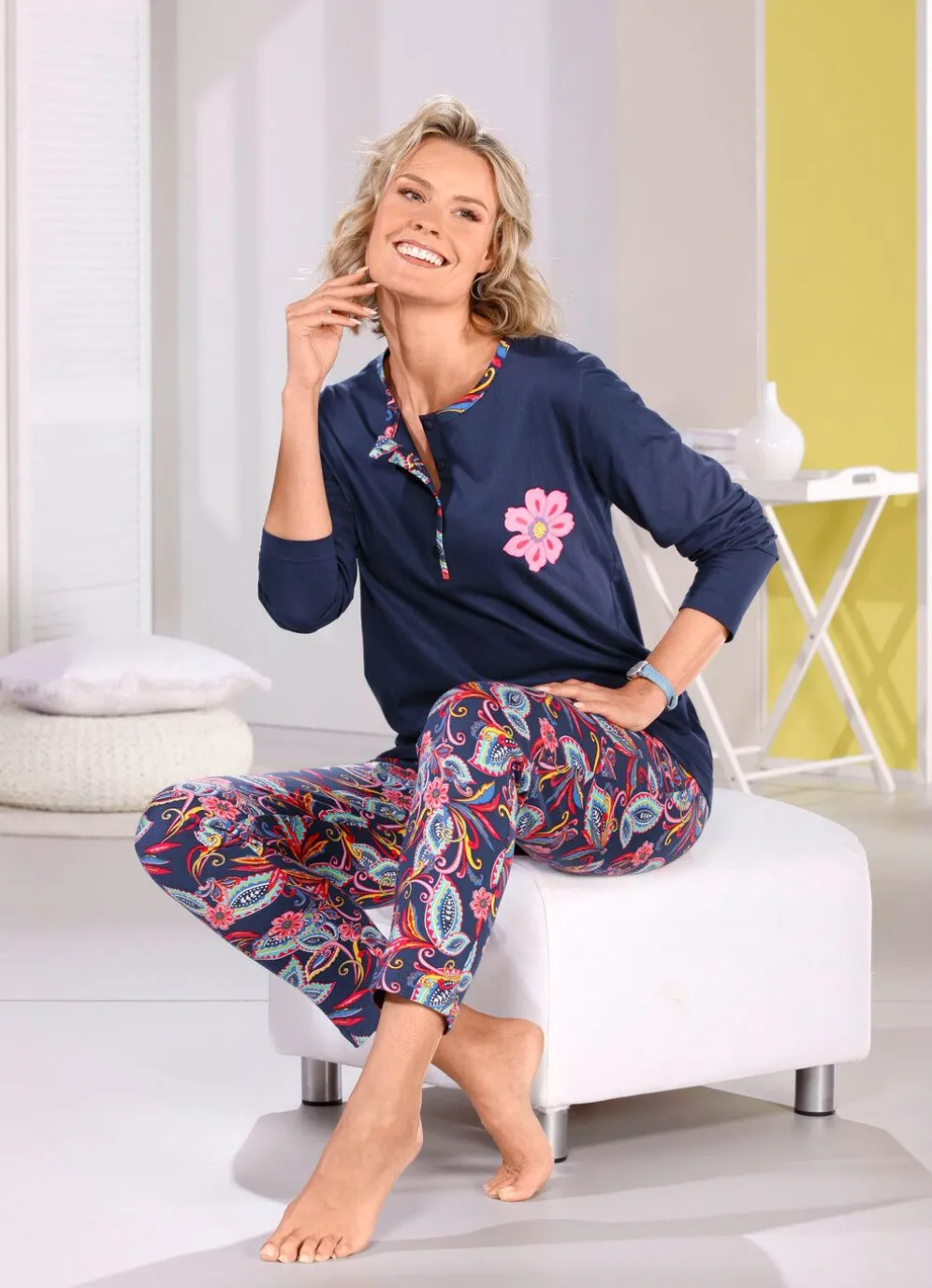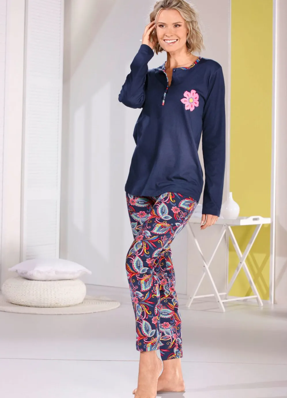 Schlafanzug in Marine-Bunt. Oberteil mit Kontrasteinfassung an Ausschnitt und Knopfleiste, platziertem