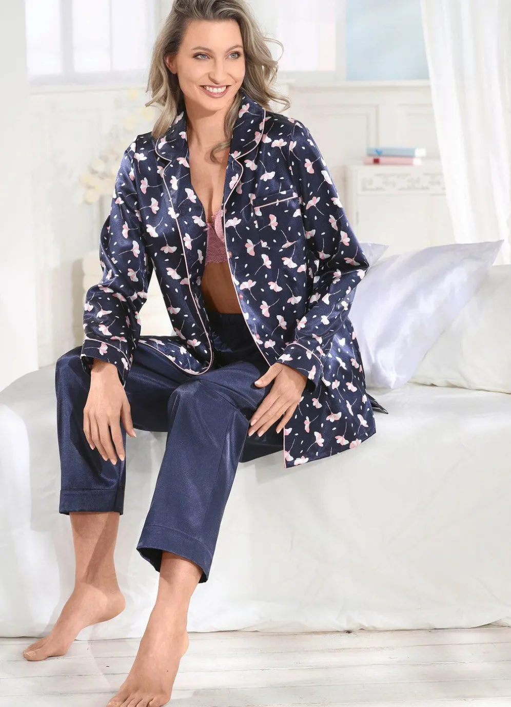 Traumhafter Schlafanzug in Marine-Rosé-Sekt! Durchgeknöpftes Oberteil mit Reverskragen, Paspeln, Brusttasche sowie langen Ärmeln. Lange Hose mit Dehnbund sowie offenen Beinabschlüssen.