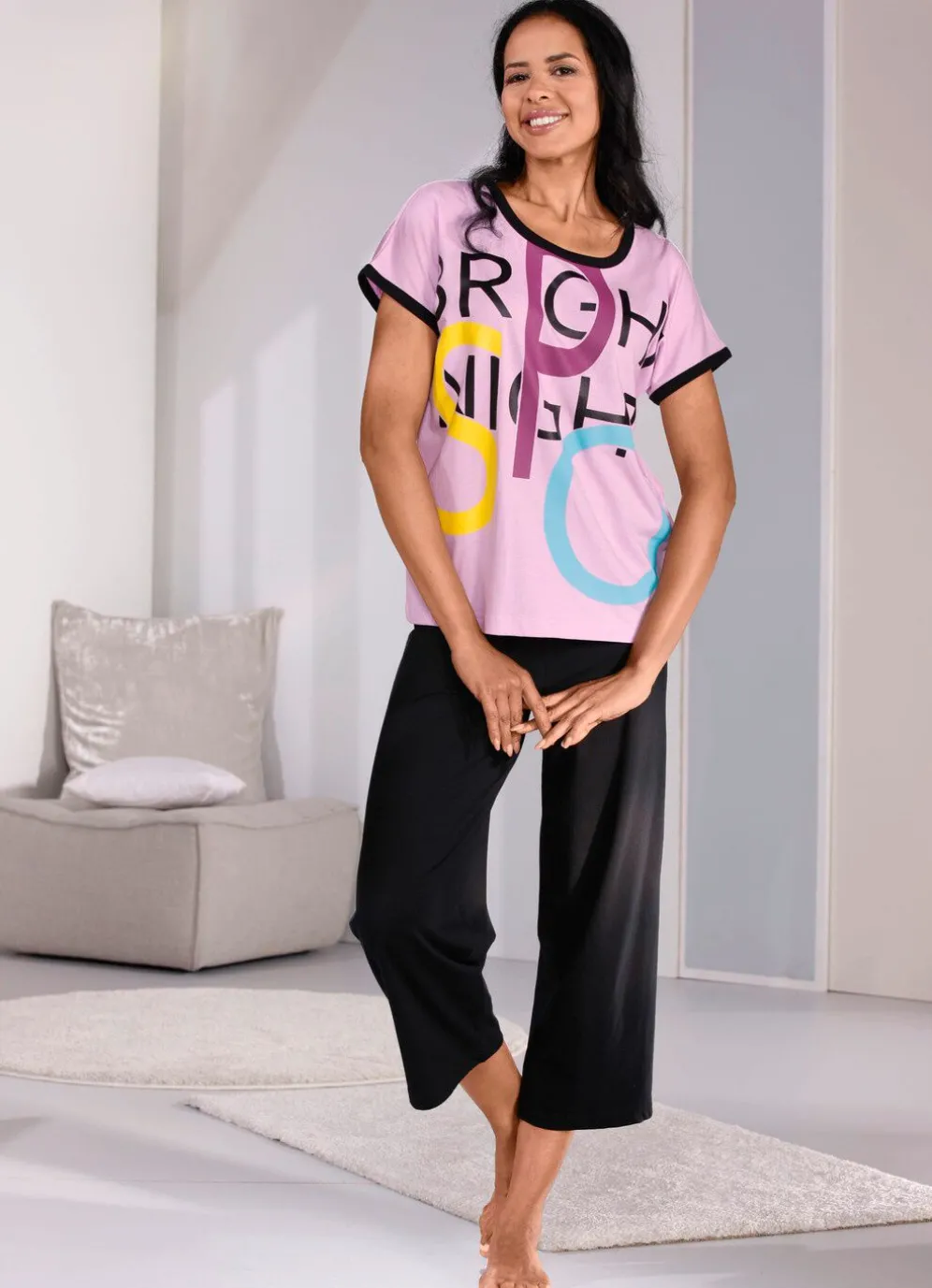 Hübscher Schlafanzug in Krokus-Schwarz-Bunt. Oberteil mit Einfassung am Halsausschnitt