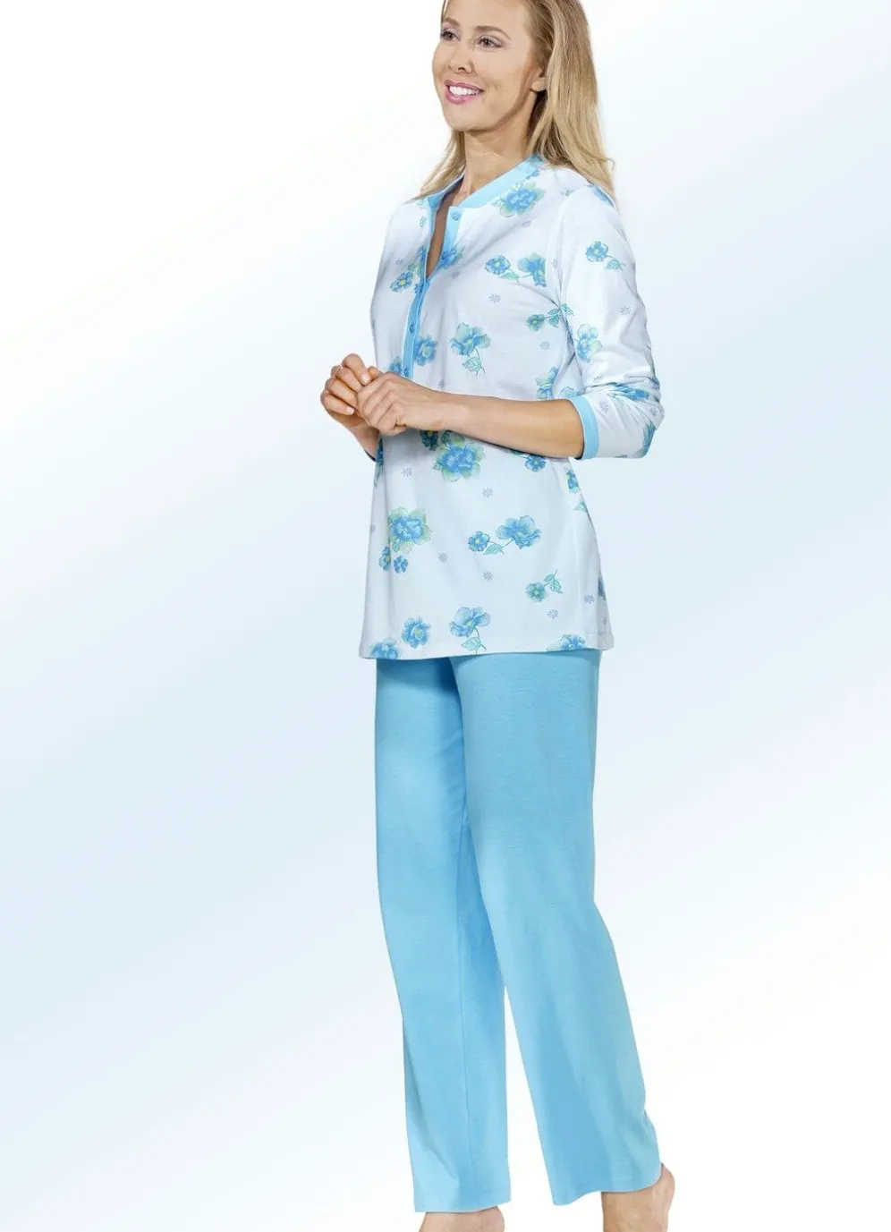 Traumhafter Schlafanzug: Oberteil mit uni Bündchen am Halsausschnitt, langer Knopleiste sowie langen Ärmeln. Lange Hose mit Dehnbund und offenen Beinabschlüssen.