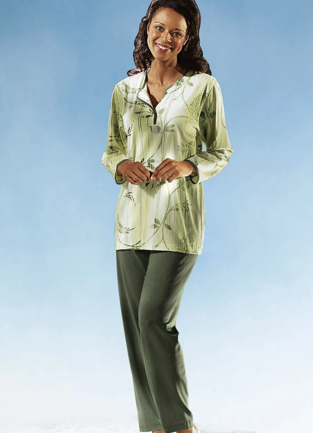 Schöner Schlafanzug: länger geschnittenes, allover dessiniertes Oberteil mit uni Einfassung am Halsausschnitt, entlang der Knopfleiste und an den Ärmelabschlüssen. Es wird ergänzt von der langen, Hose mit Dehnbund sowie offenen Beinabschlüssen.
