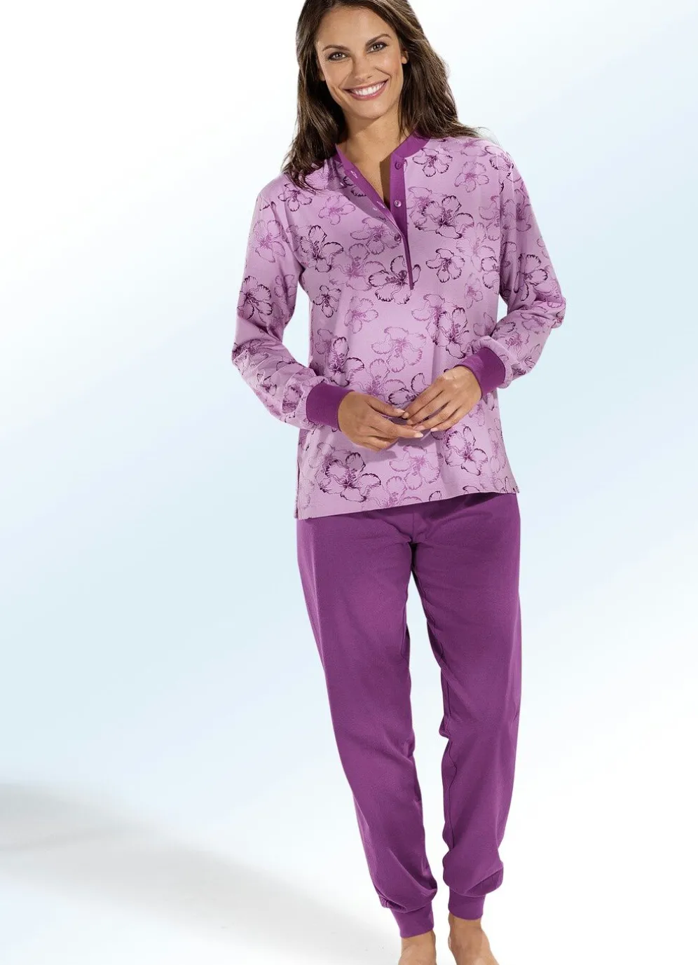 Traumhafter Schlafanzug: Oberteil mit Stehkragen, Knopfleiste sowie Bündchenabschlüssen an den langen Ärmeln. Lange Hose mit Dehnbund sowie Bündchen an den Beinabschlüssen.