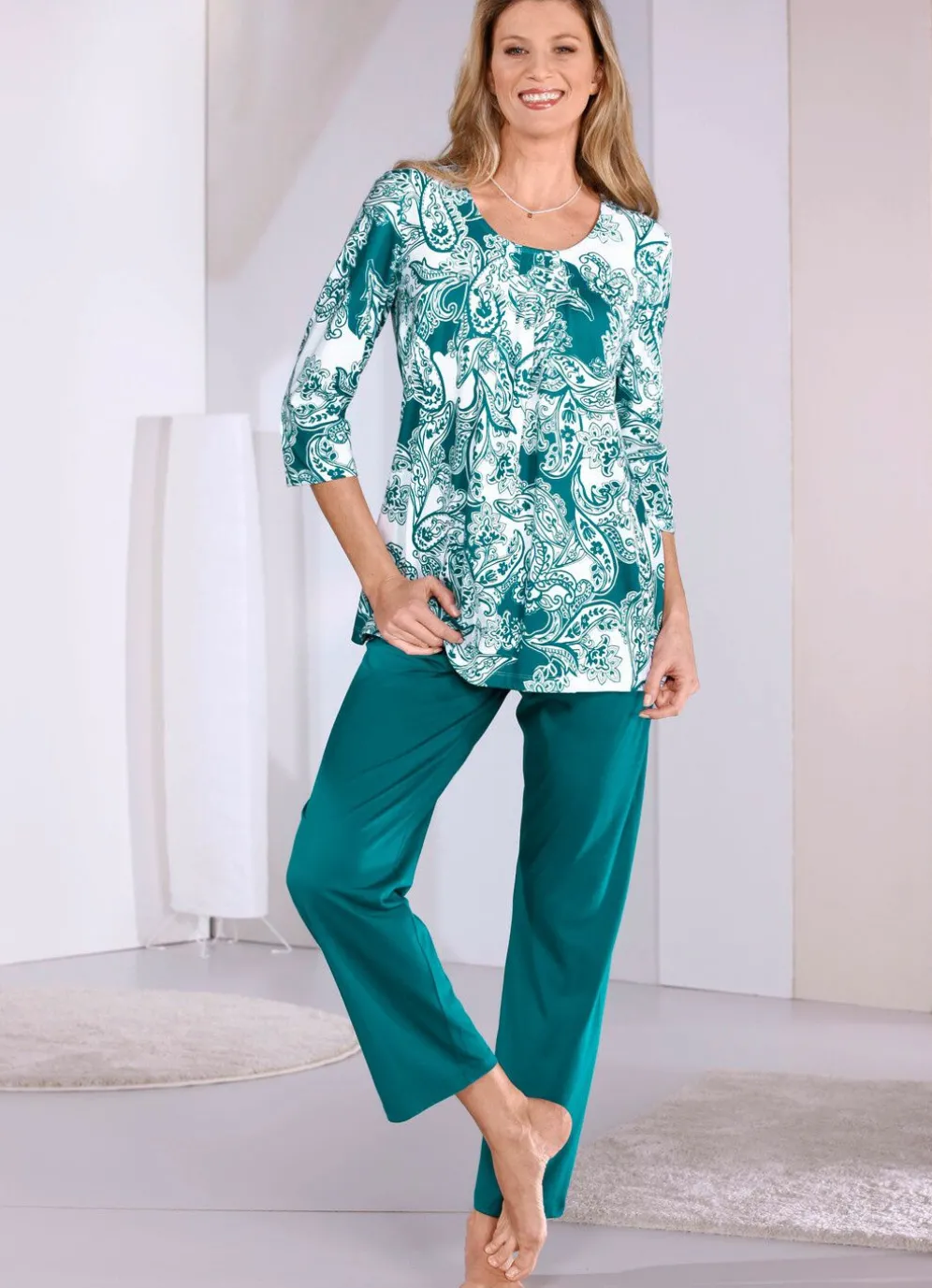 Faltenlegung unterhalb der Absteppung am Dekolleté und 3/4-langen Ärmeln. Lange Hose mit Dehnbund