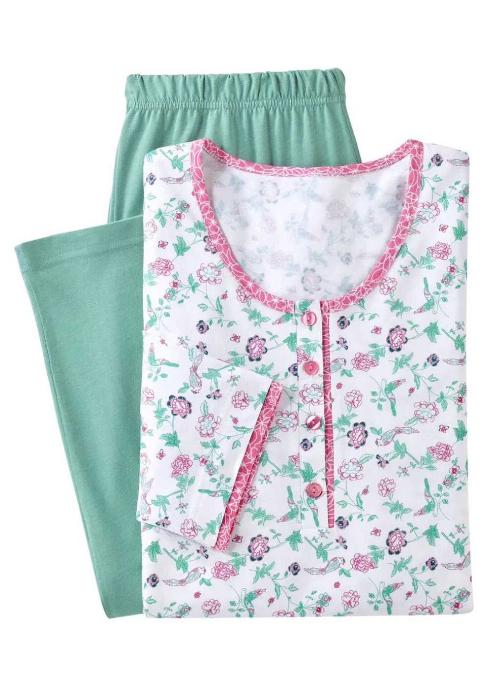 Süße Träume verspricht dieser hübsche Schlafanzug mit Allover Blumendessin auf Oberteil! Das Oberteil zeigt sich mit Einfassung am Halsausschnitt, Knopfleiste sowie Kontrastblende an den Abschlüssen der 3/4-langen Ärmel. Passend dazu erhalten Sie die 7/8-lange Hose mit Dehnbund sowie offenen Beinabschlüssen.