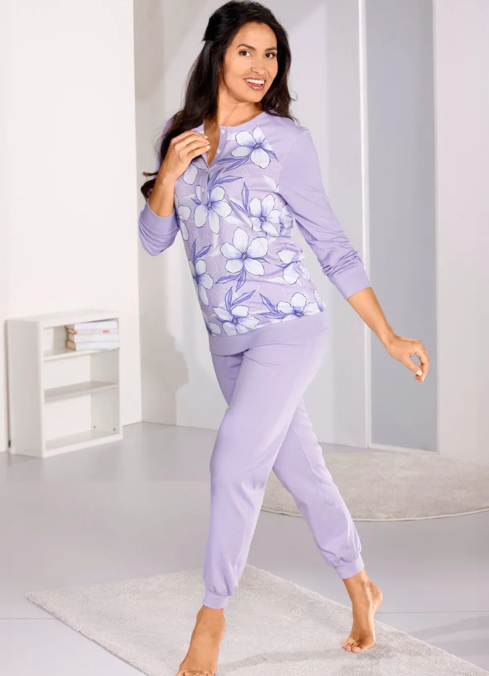 Schlafanzug in Flieder-Weiß-Bunt, mit Bündchenabschlüssen. Oberteil mit Einfassung am Hals-