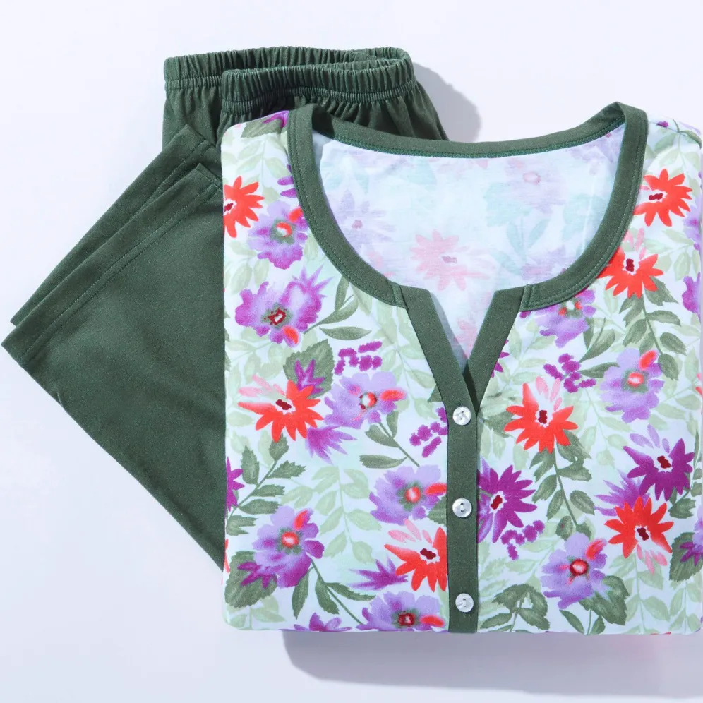 Toller Schlafanzug! Oberteil mit uni Einfassungen am Halsausschnitt, an der Knopfleiste und den Abschlüssen der 3/4-langen Ärmel. 7/8-lange Hose mit Dehnbund und offenen Beinabschlüssen.