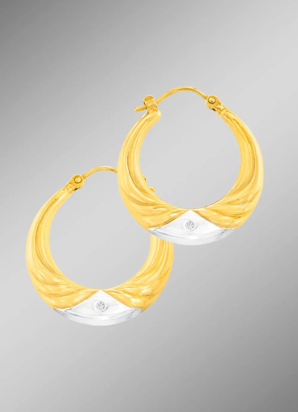 Diese schlichten Creolen aus Gold 585/- fein, oder Gold 333/- fein in Bicolor verziert mit 2 Diamanten, Weiß, Piqué 2, werden Ihren Look zum Strahlen bringen.