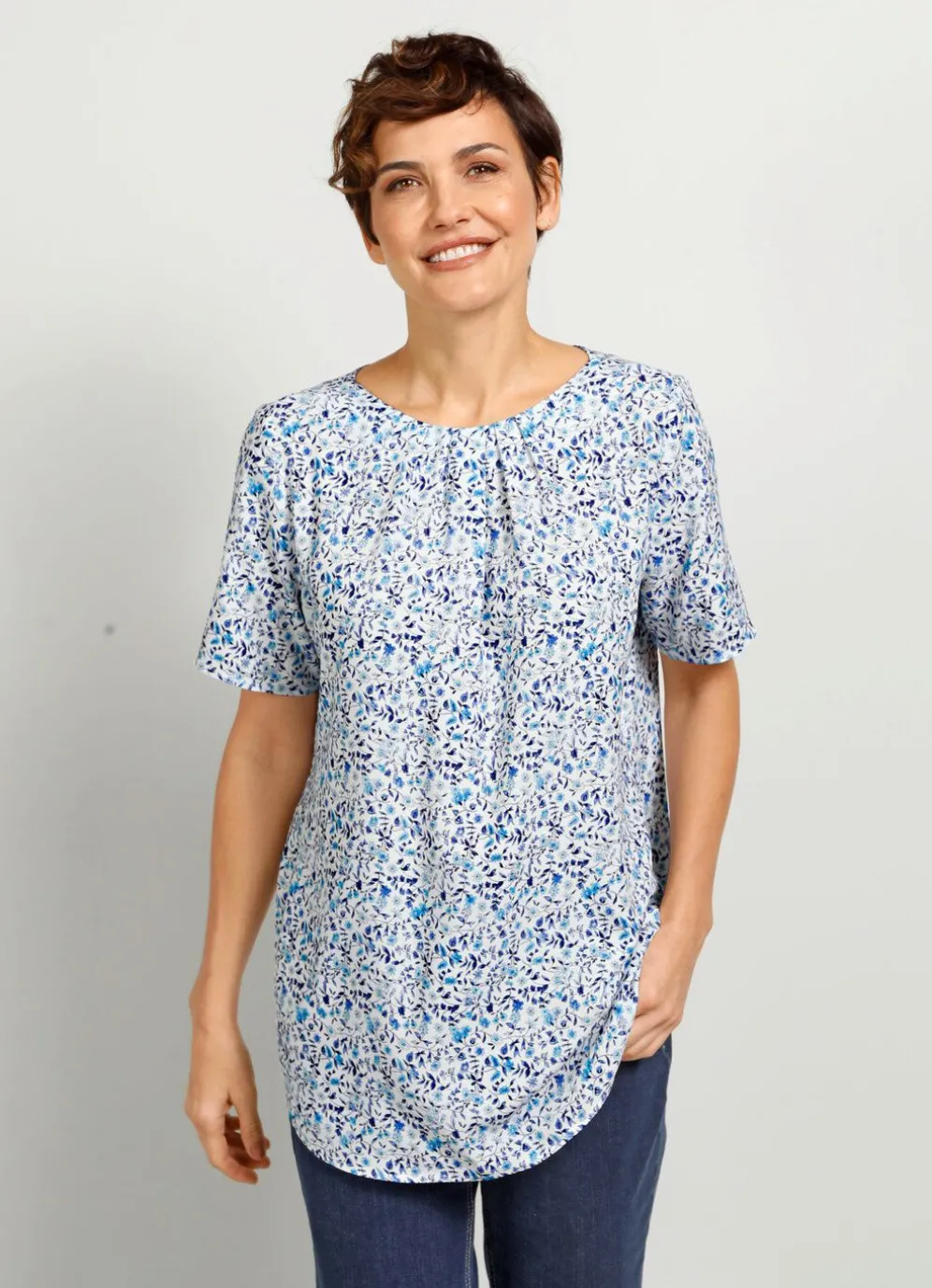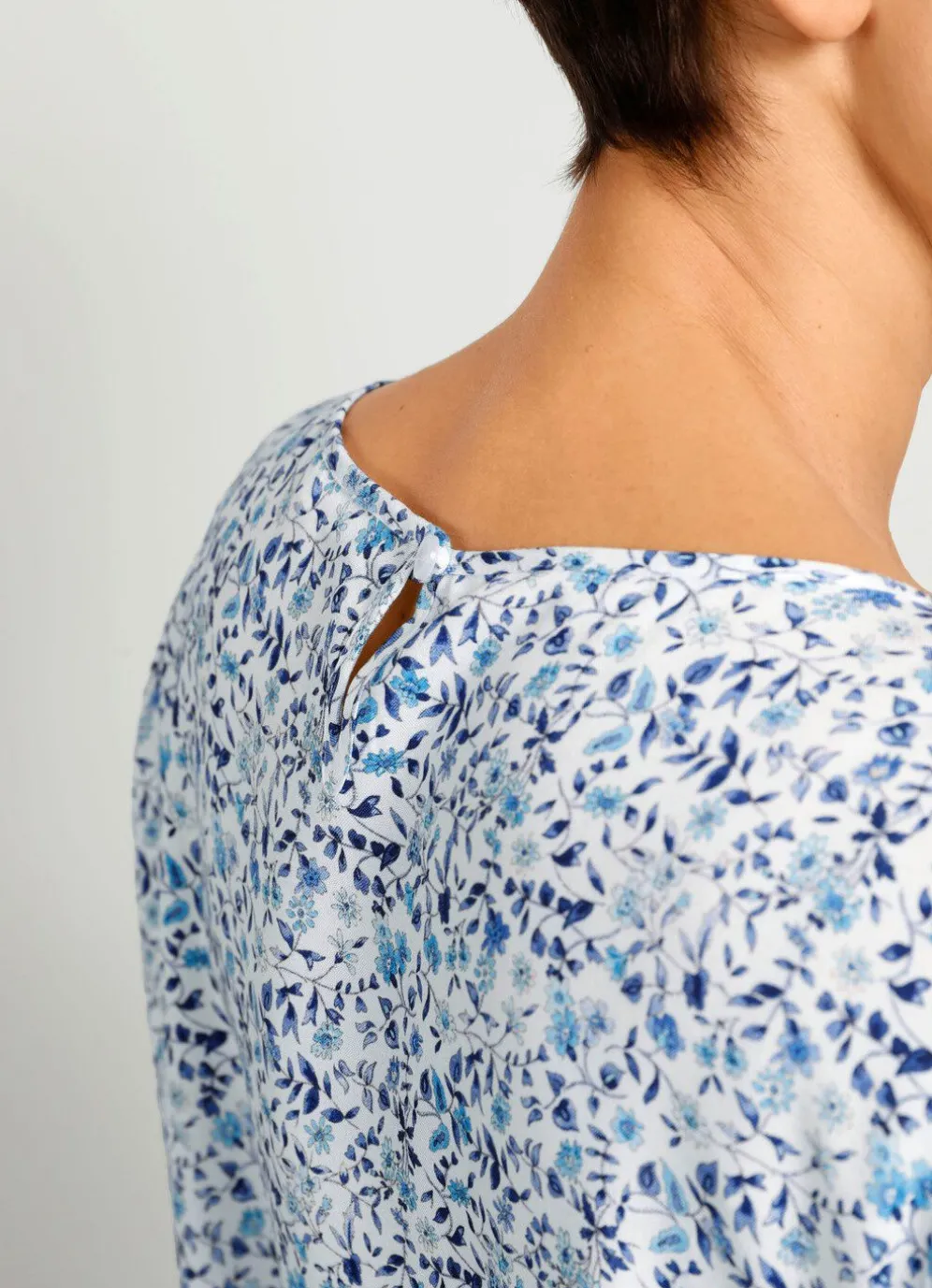 Schlupfbluse mit wunderschönem Floralprint. Die Bluse hat einen Rundhalsausschnitt und ist gerade geschnitten. Die Ärmel sind halblang mit geradem Abschluss.