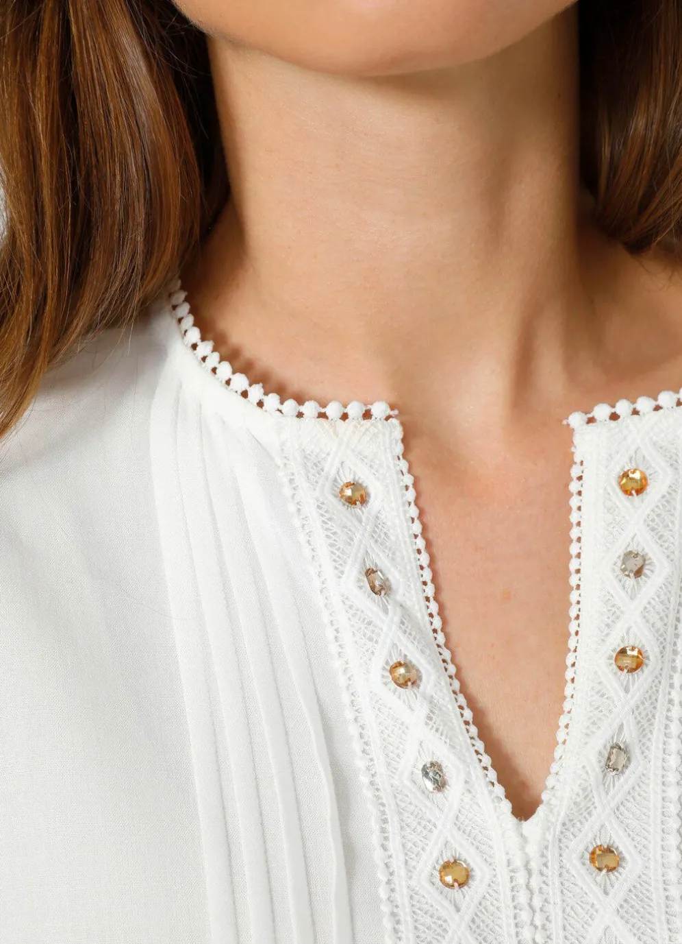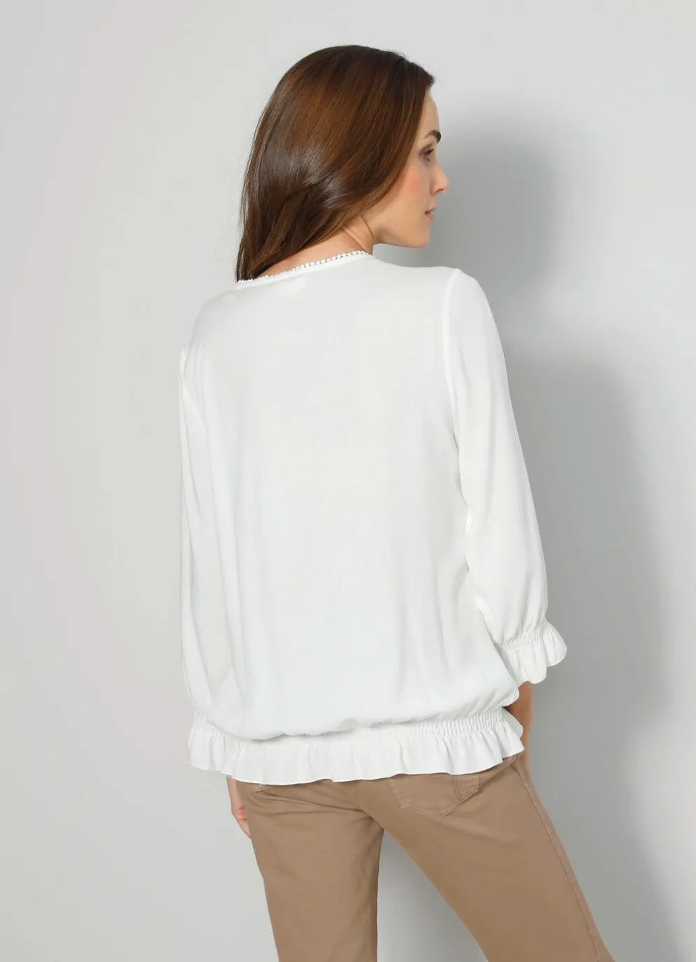 Bluse mit Rundhals und V-Ausschnitt. Darüber hinaus ist sie gerade geschnitten. Die 3/4-lange Ärmel sind mit einem Gummizug und Rüschen ausgestattet.