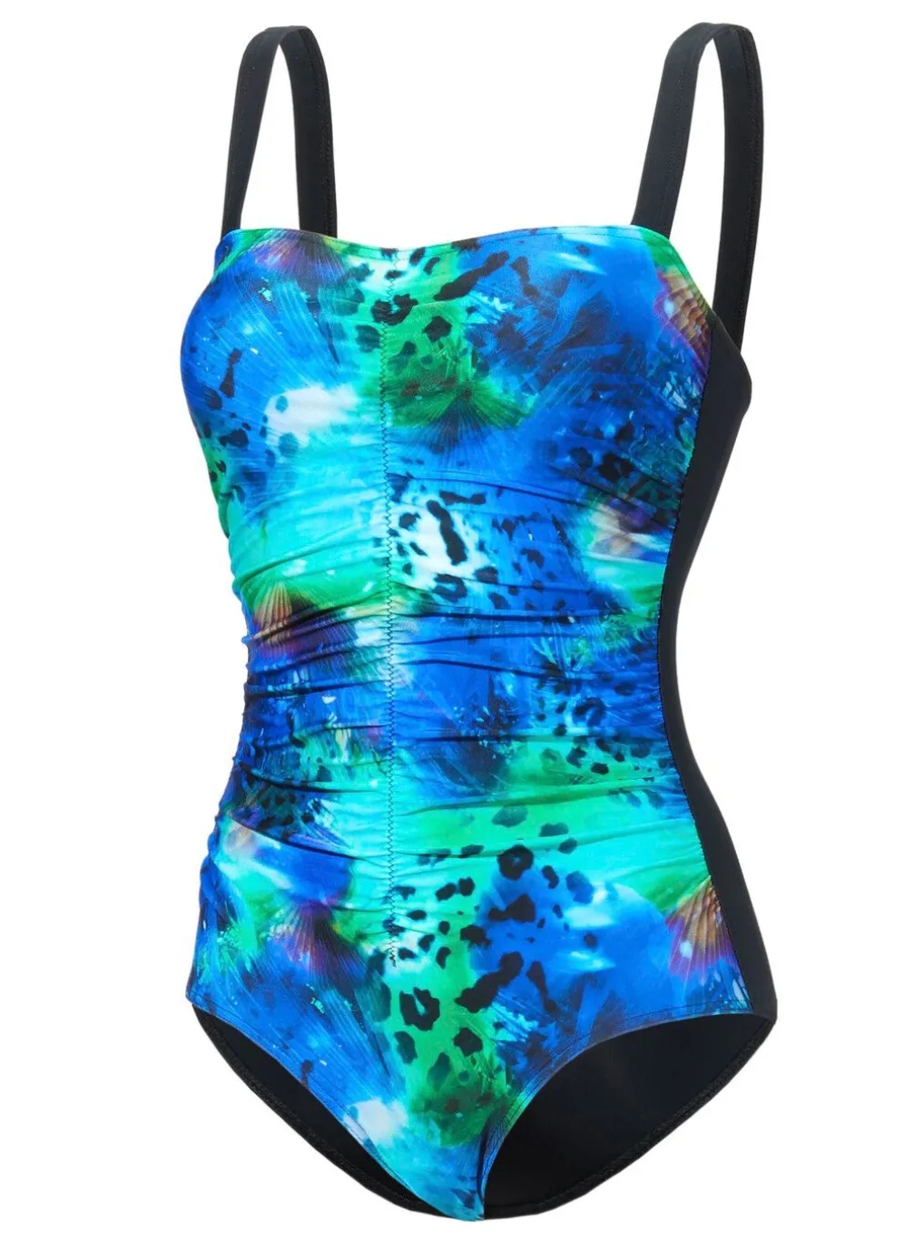 Schwarzer „Schwab“-Badeanzug in Bandeauform: allover royalblau-bunt dessiniert im Vorderteil, Raffungen seitlich und in der vorderen Mitte, Halbkorsage, Softschalen sowie Unterbrustband.