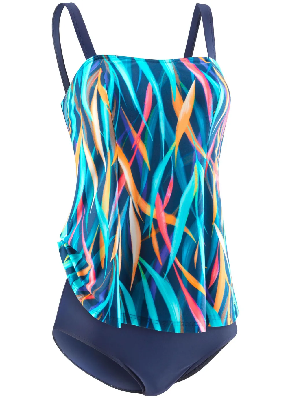 Toller „Schwab“-Tankini mit marine-buntem Druckdessin im Vorderteil, ausgestelltem Oberteil in Bandeauform, sowie Softschalen und Unterbrustband. Höschen in Marine.