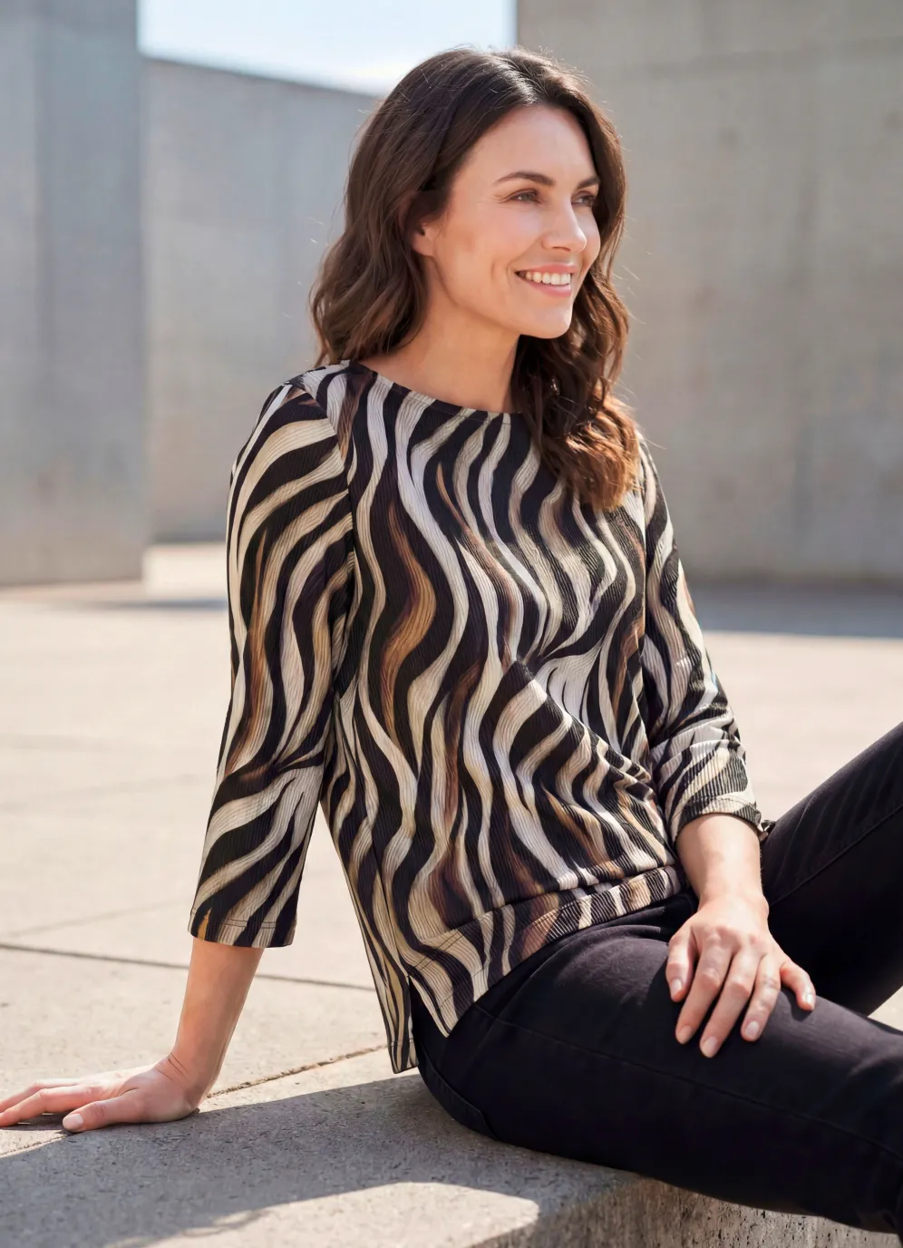Jedes Teil ein Unikat! Exellentes Shirt von Stilschmiede in Schwarz-Braun-Ecrufarbenem Allover-Dessin, 3/4 langen Ärmeln sowie Seitenschlitzen.
