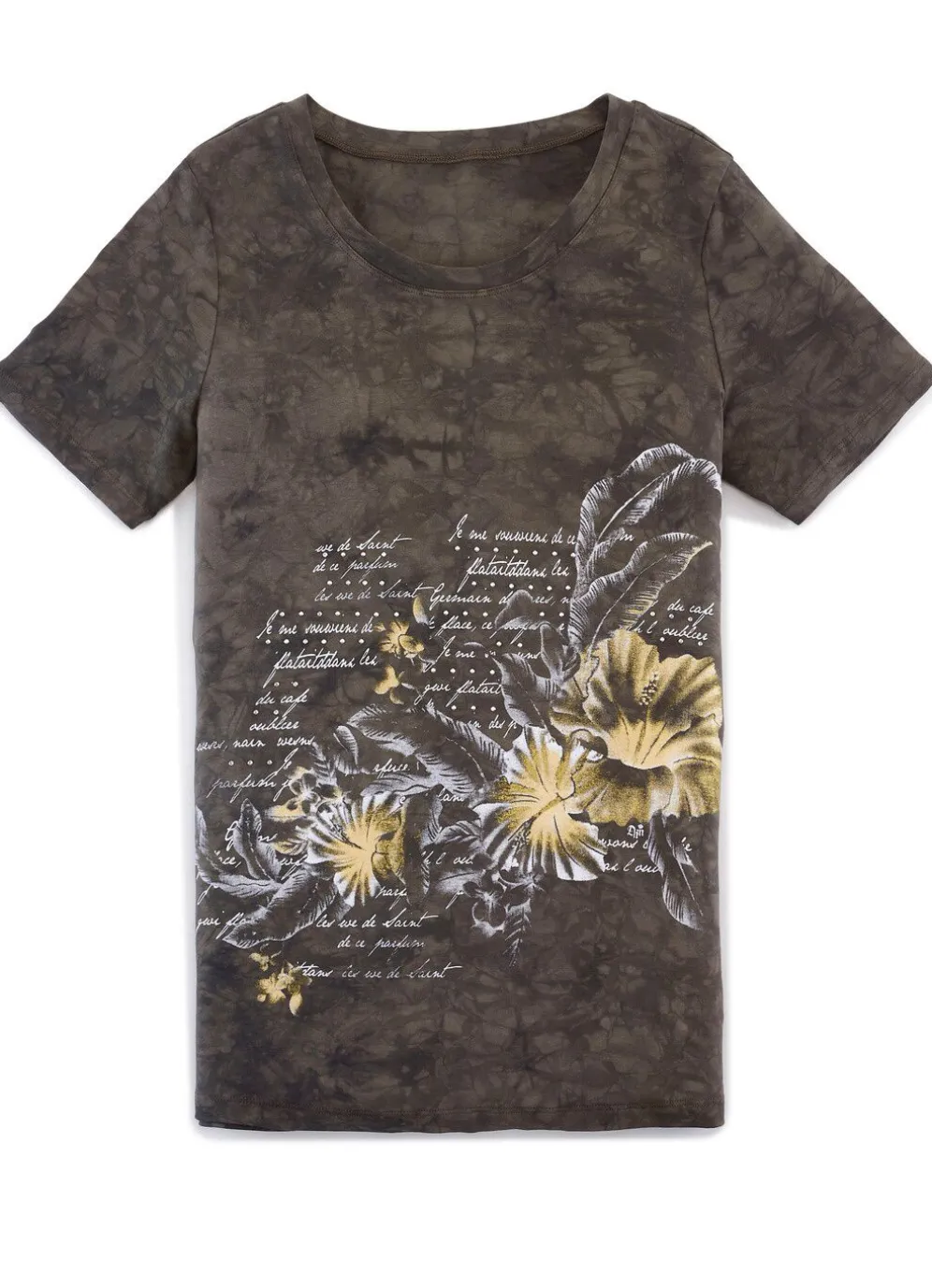 Jedes Teil ein Unikat! Große Klasse ist dieses einzigartige Shirt in aktueller Batik-Optik, Kontrast-Druck mit Strasszier im Vorderteil.