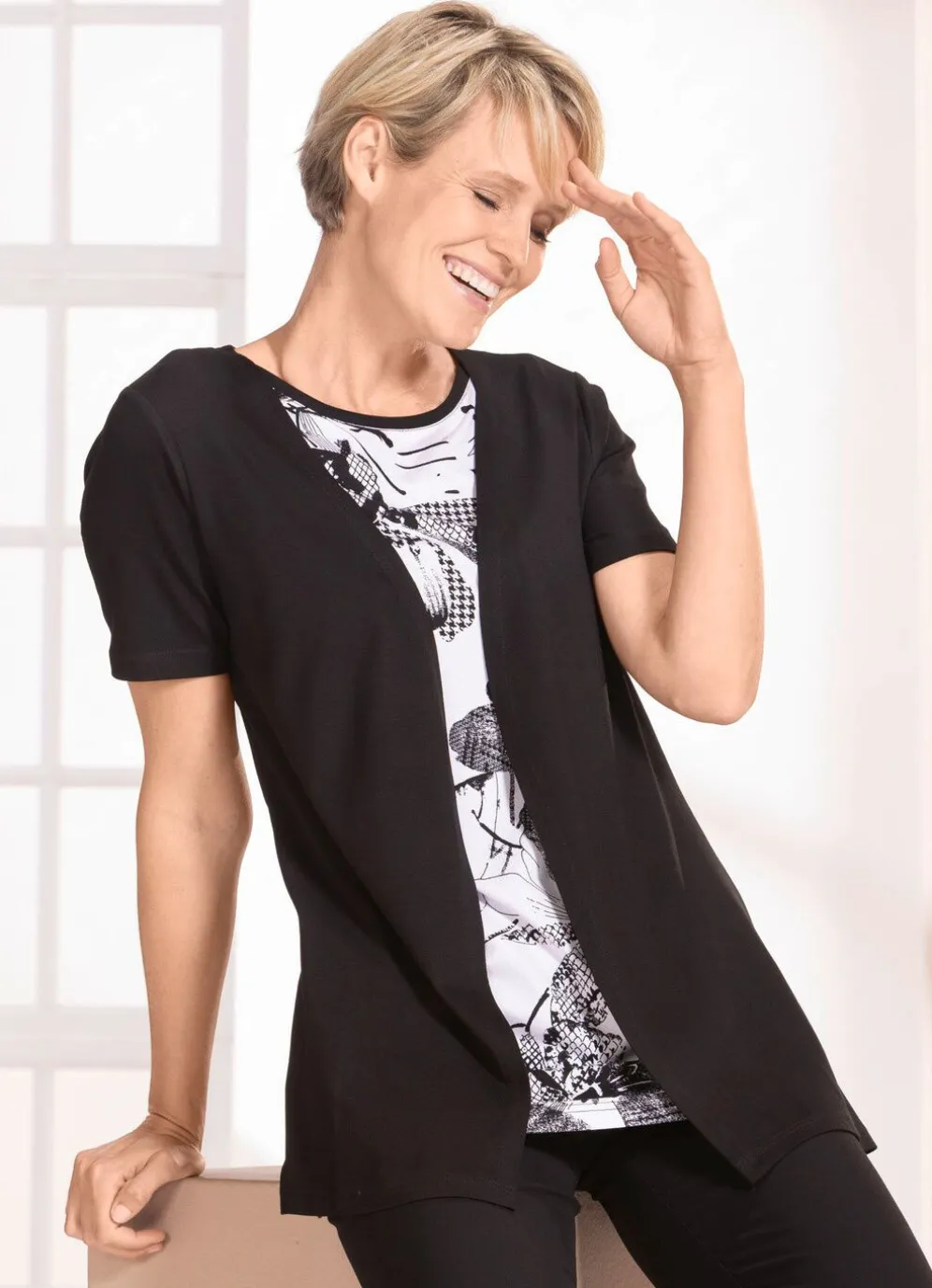 Jedes Teil ein Unikat! Große Klasse ist dieses flotte schwarze Shirt in schicker Doppeloptik und schwarz-weißem, farbbrillantem Einsatz im Vorderteil.