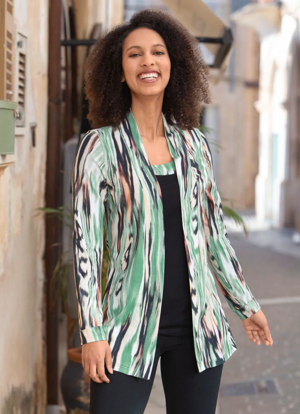 Jedes Teil ein Unikat! Große Klasse ist dieses geschmackvolle Shirt in schwarz-grün-apricotfarbene allover in Jacken-Optik, mit schwarzem Einsatz und Kontrastblende am Halsausschnitt sowie lange Ärmel mit Bundabschluss.