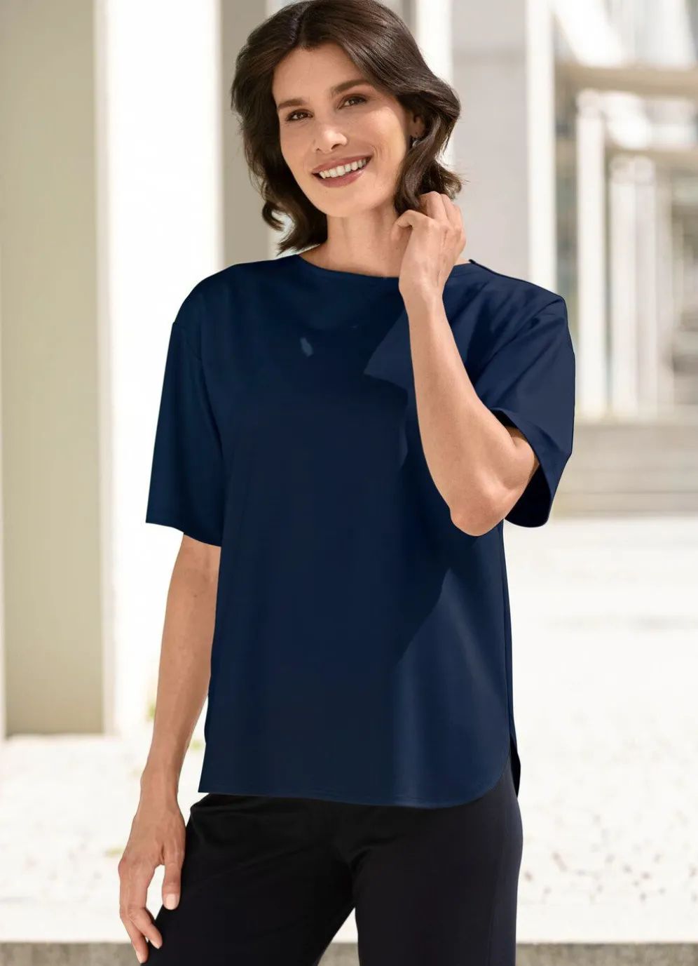 Flottes Shirt mit rundem Halsausschnitt, in weiter Form und abgerundetem Saumabschluss. Länge ca. 65 cm, ab Gr. L ca. 68 cm.