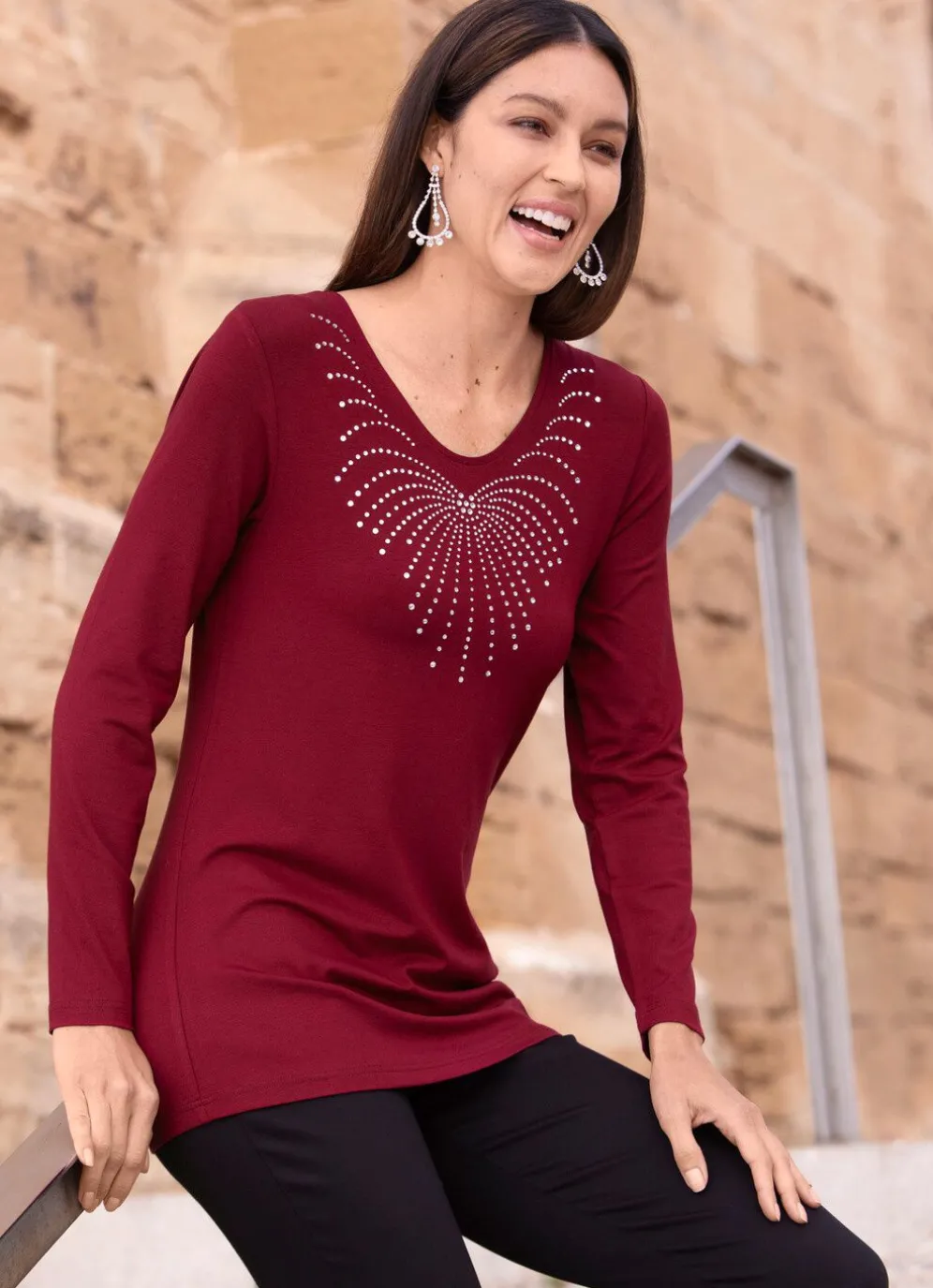 Exquisites Shirt mit abgerundetem V-Ausschnitt und aufwendiger Strasszier im Vorderteil.