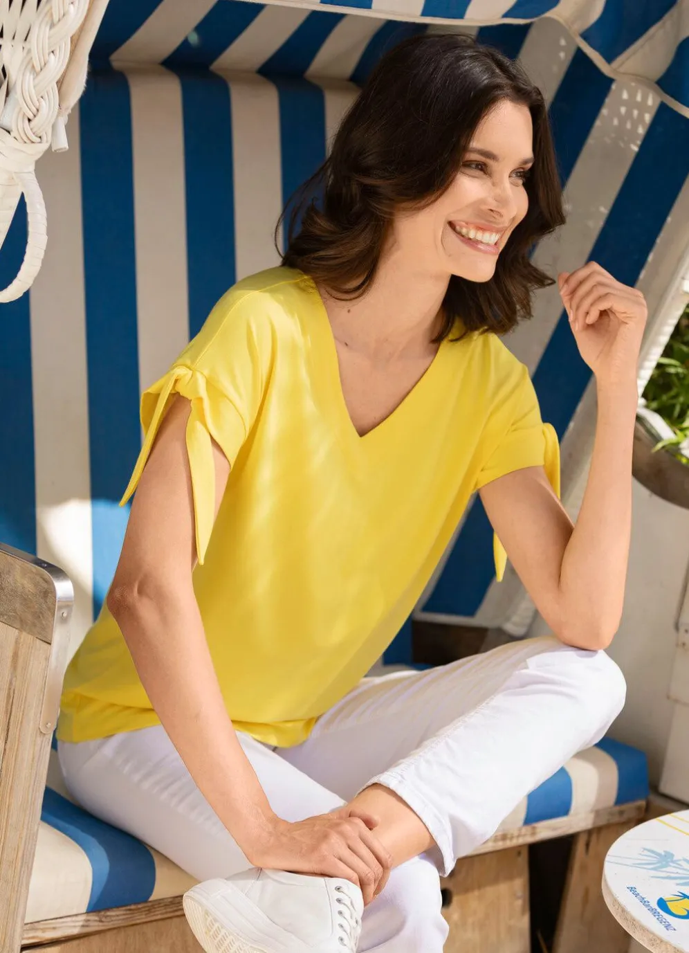 Ansprechendes Shirt von laurakent mit angesetztem Abschluss an der überschnittenen Schulterpartie und Bindeband.