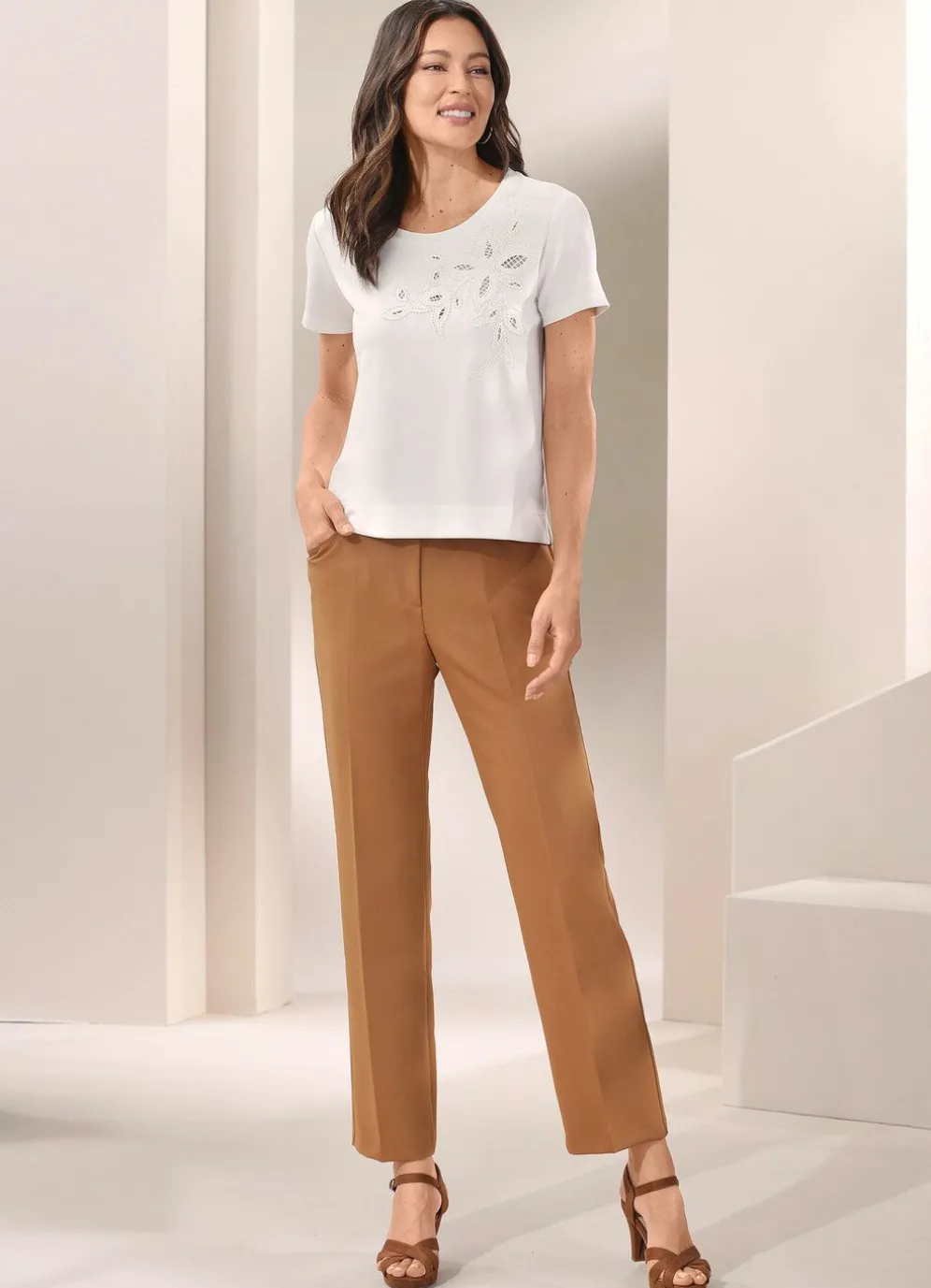 Feminines Shirt von TIZIA mit edler Lochstickerei, Perlen- und Netzzier im Vorderteil, sowie Bündchen und Seitenschlitze am Saum.