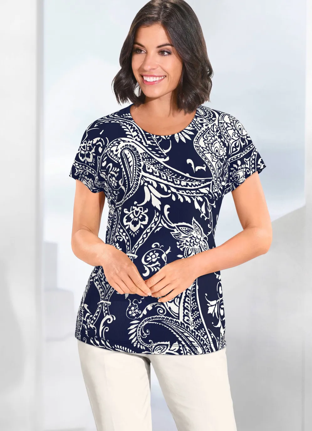 Jedes Teil ein Unikat! Allover dessiniertes Shirt mit farbbrillantem Druck in Marine-Ecru, rundem Halsausschnitt, überschnittener Schulterpartie sowie leicht abgerundetem Saum vorne und hinten.