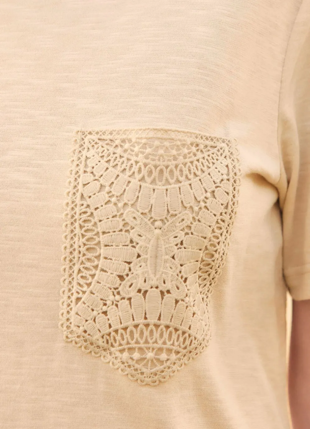 Beigefarbenes Shirt von laurakent mit Brusttasche aus Häkelspitze.