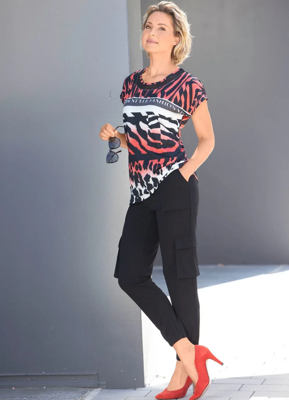 Große Klasse ist dieses modische Shirt mit Netz-Jersey-Einsatz am Halsausschnitt, überschnittener Schulterpartie, Kontrast-Schriftzug, silberfarbenen Zierplättchen, Flatlocknähten im schwarz-koralle-weißen Vorderteil sowie schwarz-korallefarbenem Rückteil.