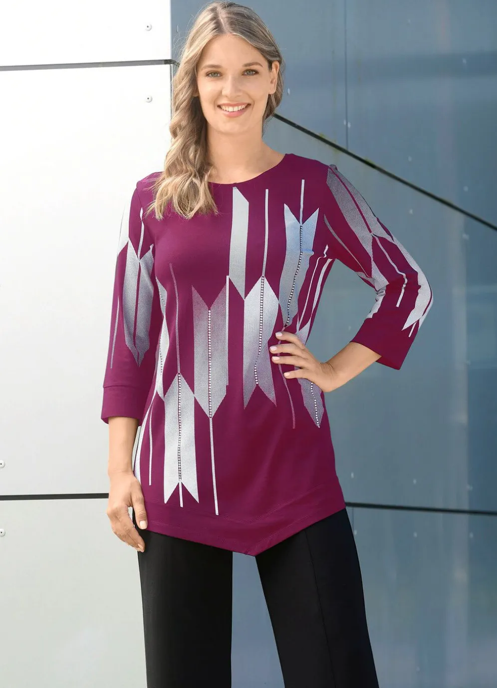 Ausgefallenes Shirt mit Kontrastdruck im strassverzierten Vorderteil und an den 3/4-langen Ärmeln mit Bündchenabschluss sowie angesetzter, spitz zulaufender Saumabschluss vorne.