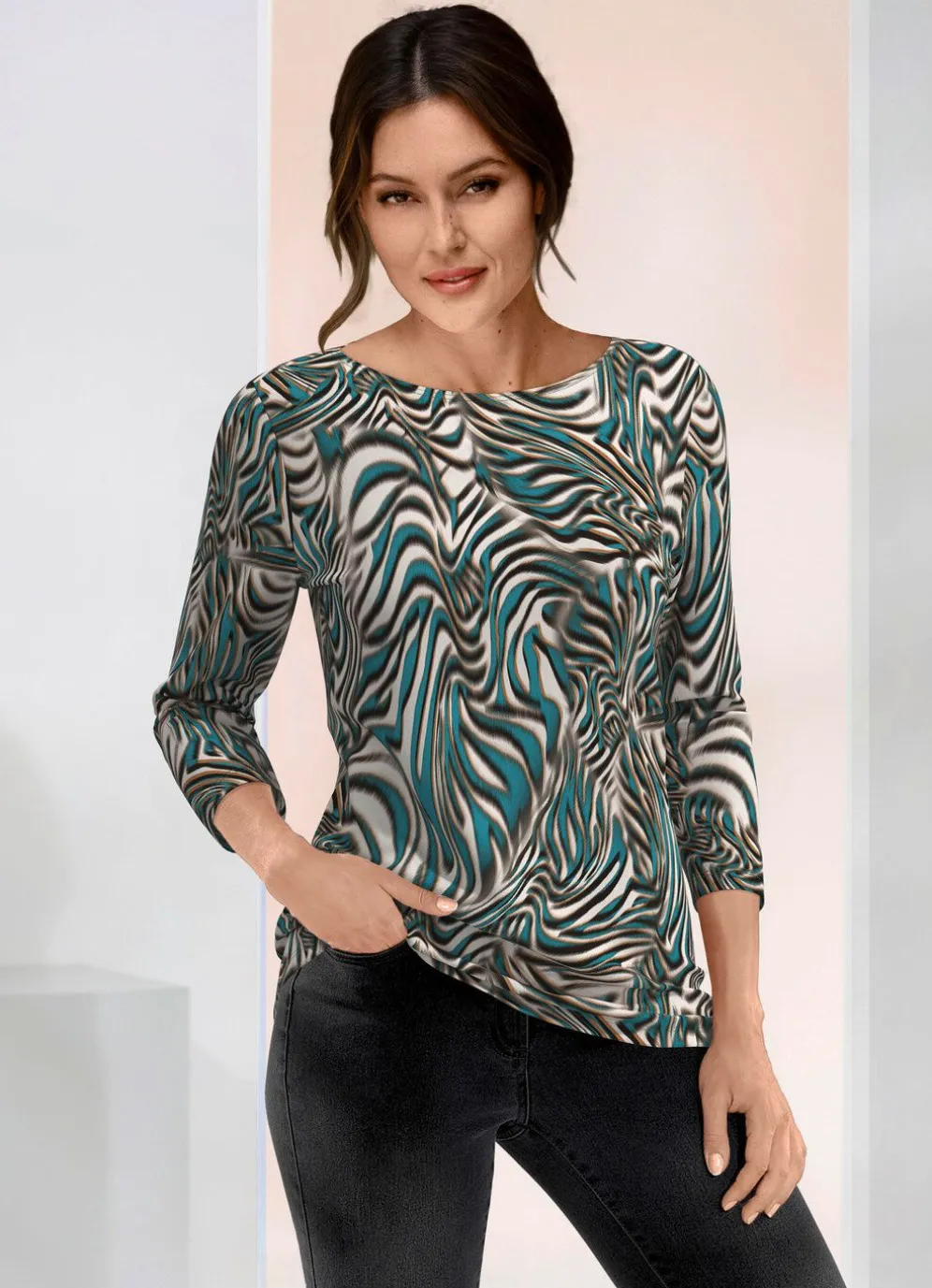 Jedes Teil ein Unikat! Ansprechendes Shirt mit tollem Allover-Dessin, modischem U-Boot-Ausschnitt sowie 3/4-langen Ärmeln.