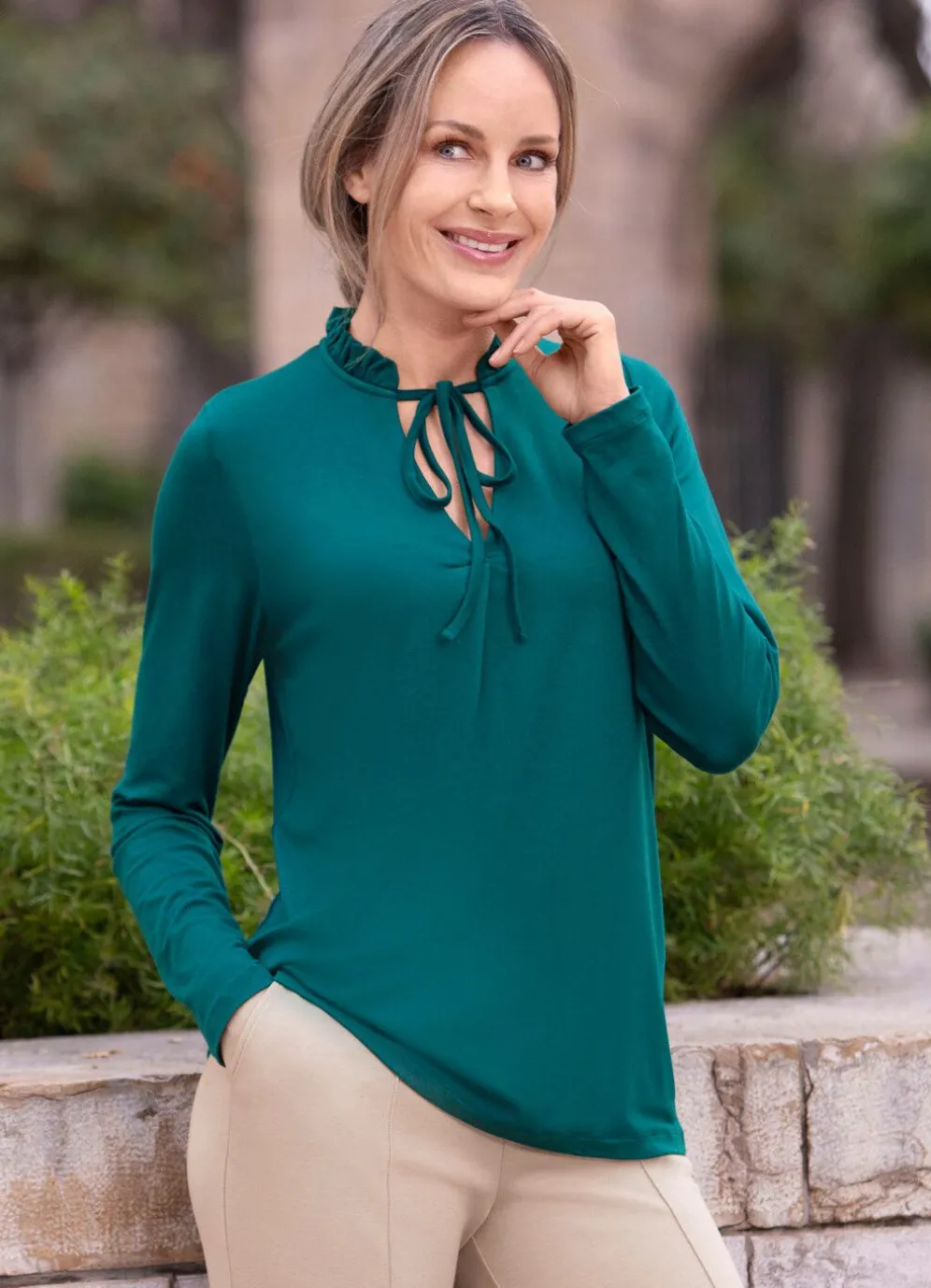 Raffiniertes Shirt mit Rüschenverarbeitung und Bindeband am V-Ausschnitt, sowie Faltenlegung im Vorderteil.