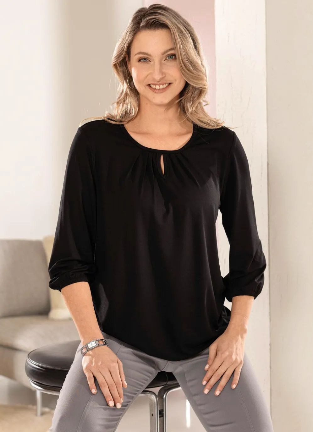 Ein toller Kombipartner ist dieses Shirt mit Schlitz und Faltenlegung am Halsausschnitt sowie elastischen Abschlüssen an den 3/4 langen Ärmeln und am Saum.