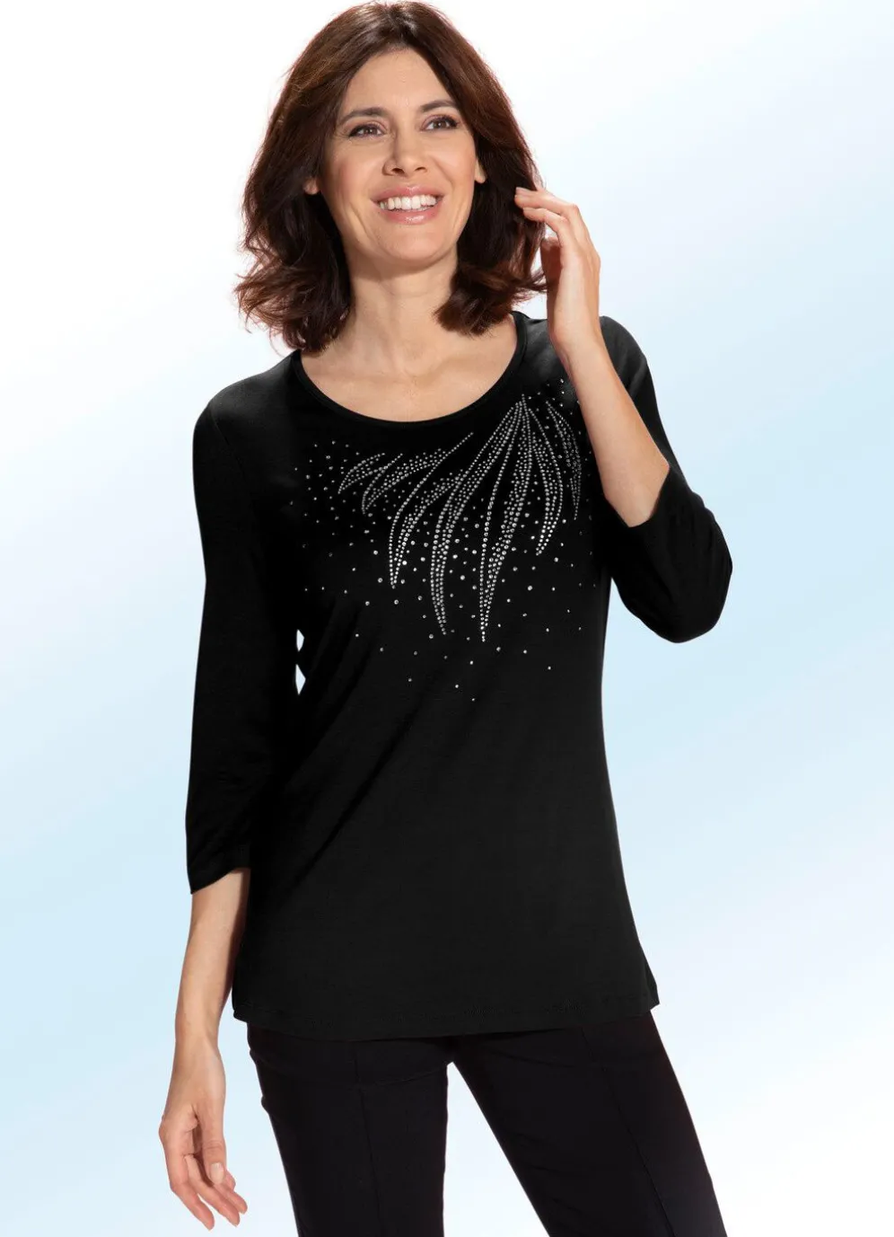 Besonders charmantes Shirt mit schmückender Strasszier im Vorderteil sowie 3/4-langen Ärmeln.