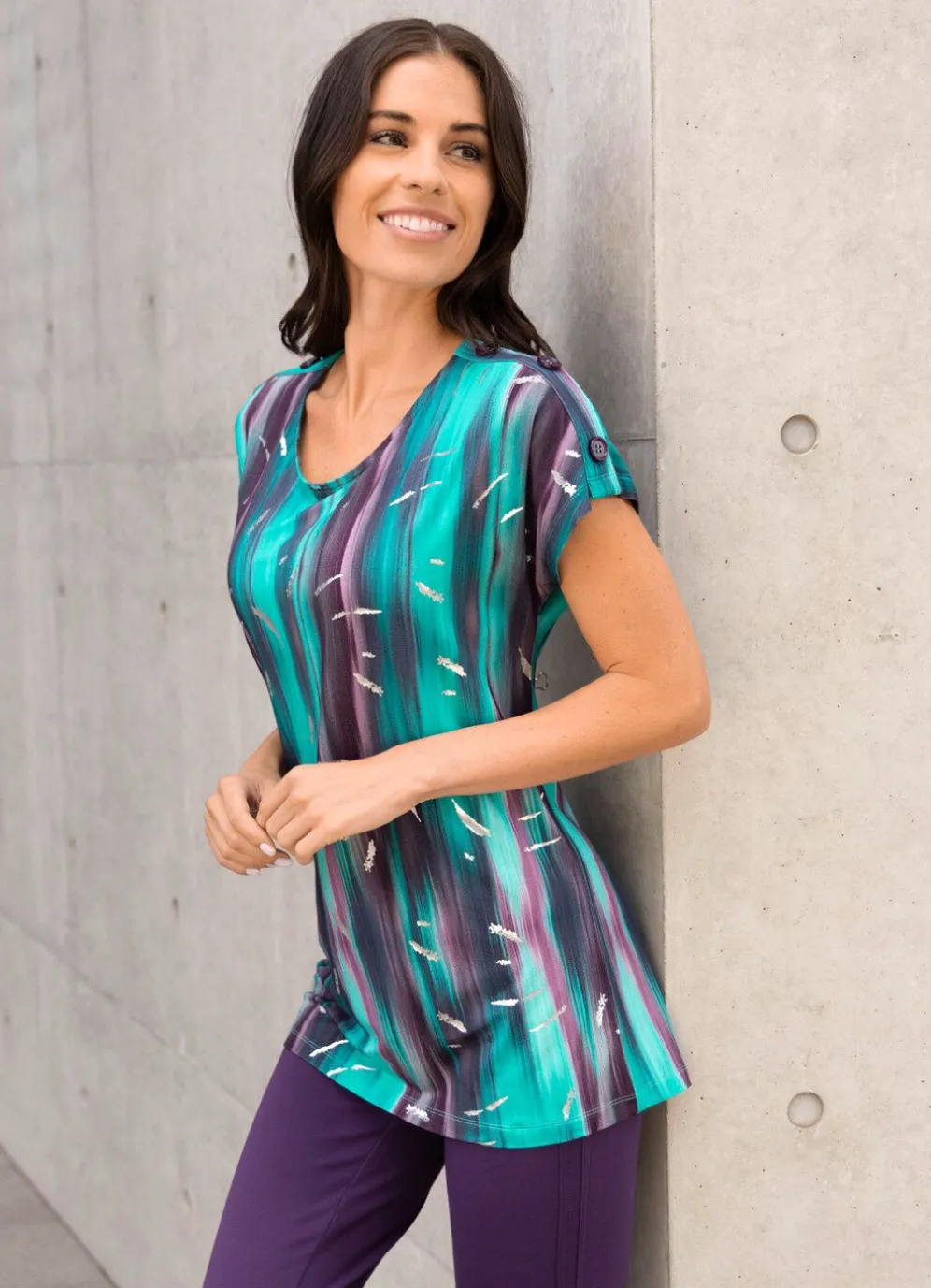 Jedes Teil ein Unikat! Hinreißendes Shirt mit farbbrillantem Allover-Druck in Smaragd-Beere, silberfarbener Foliendruck im Vorderteil sowie überschnittene Schulterpartie mit Zierknöpfen.
