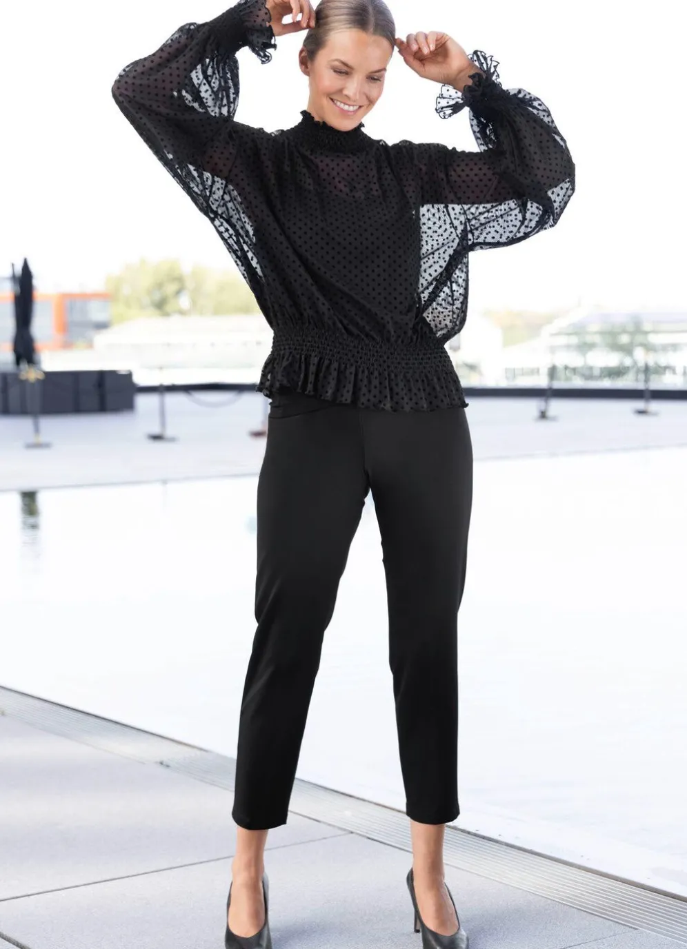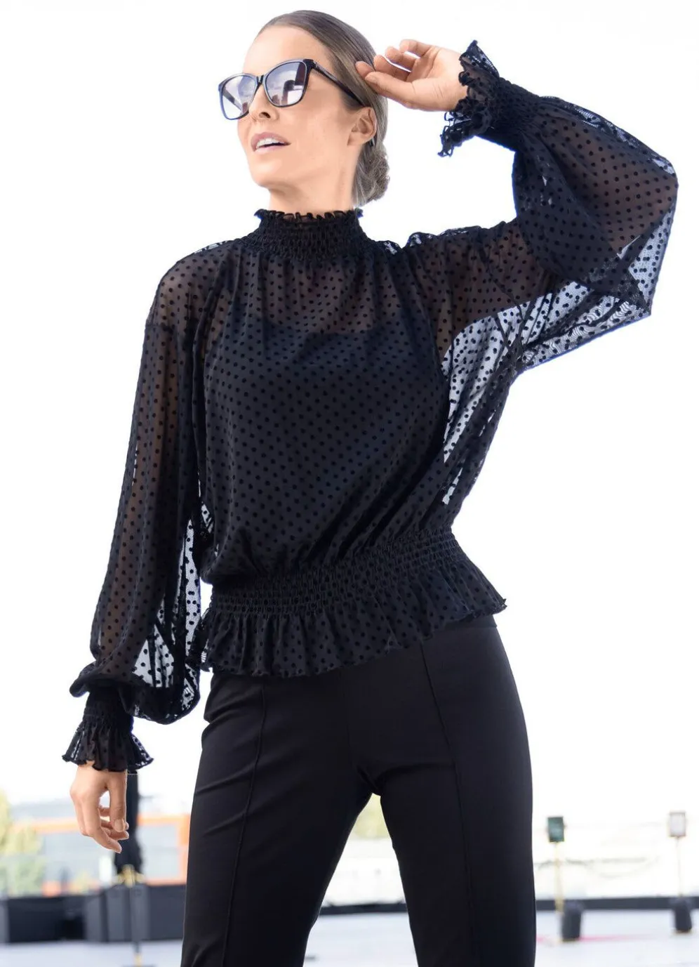 Denzent trasparentes Shirt von TIZIA mit Smokverarbeitung am Stehkragen, den langen Ärmeln und am Saum, sowie gekäntelte Abschlüsse.