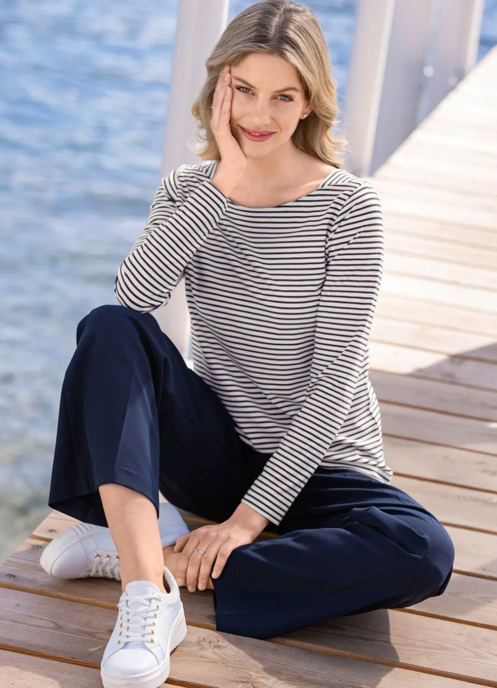In maritimen Look zeigt sich dieses Shirt, mit aparter Ausschnittlösung sowie langen Ärmeln.
