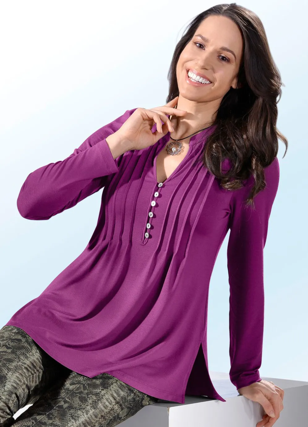 Ansprechende Shirt-Tunika mit Stehkragen, kurzer Schlingenknopfleiste, langen Ärmeln, attraktiver Biesenzier mit aufspringenden Fältchen im Vorderteil sowie Seitenschlitzen.