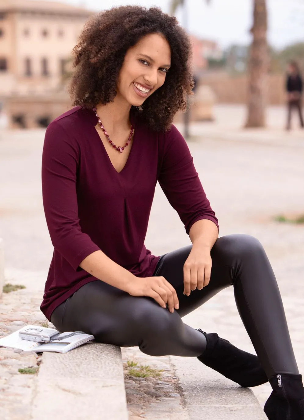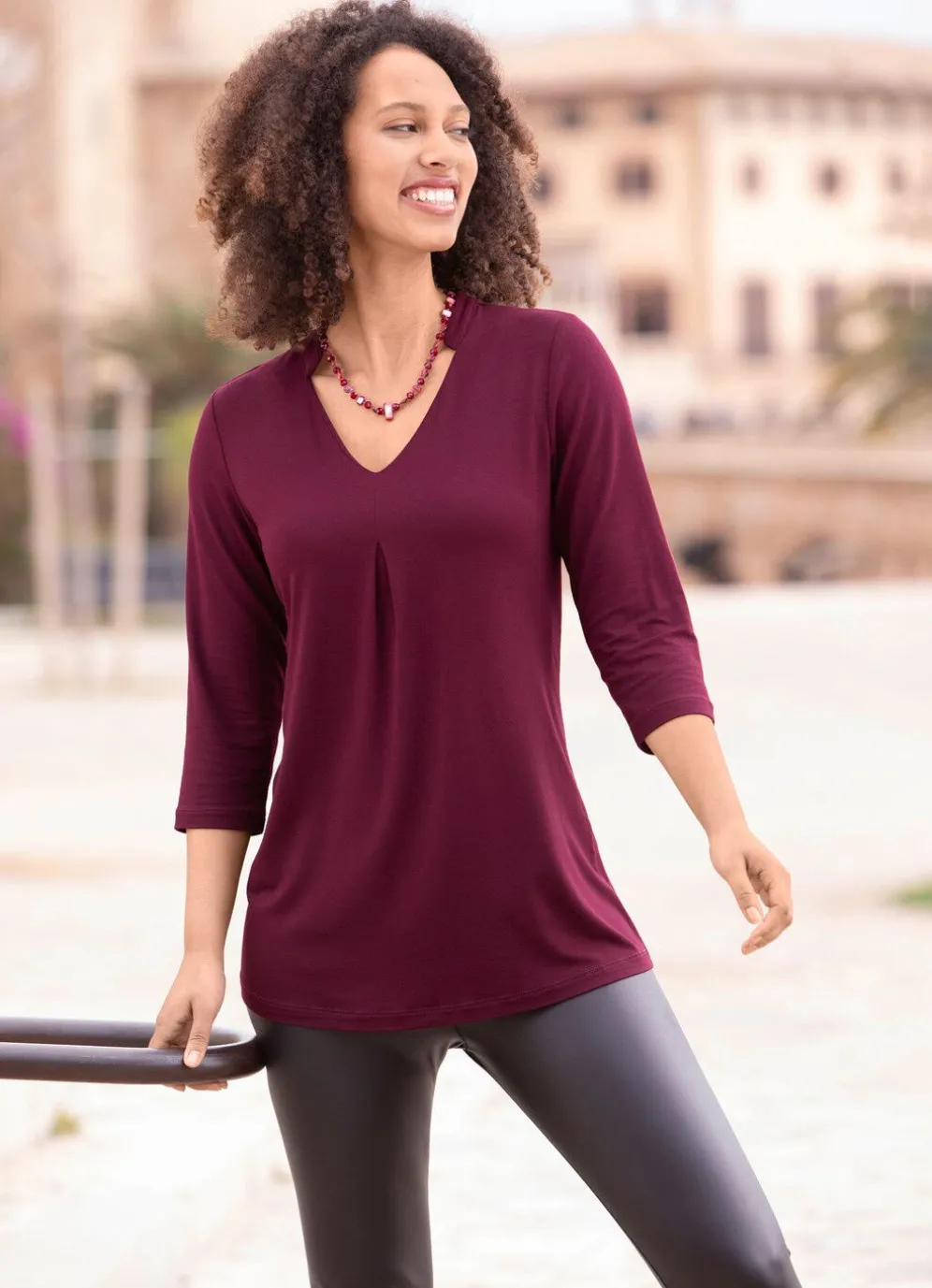 Aktuelle Shirt-Tunika mit V-Ausschnitt am Stehkragen, hübscher Fältelung im Vorderteil, 3/4-langen Ärmeln sowie Rückenpasse.
