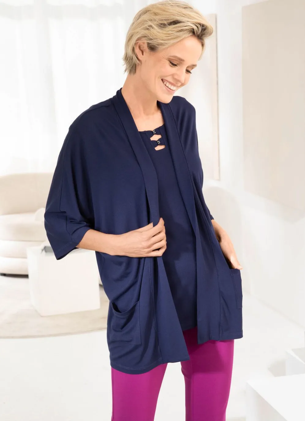 Shirtjacke in verschlussloser Form mit aufgesetzten Taschen und Fledermausärmeln.