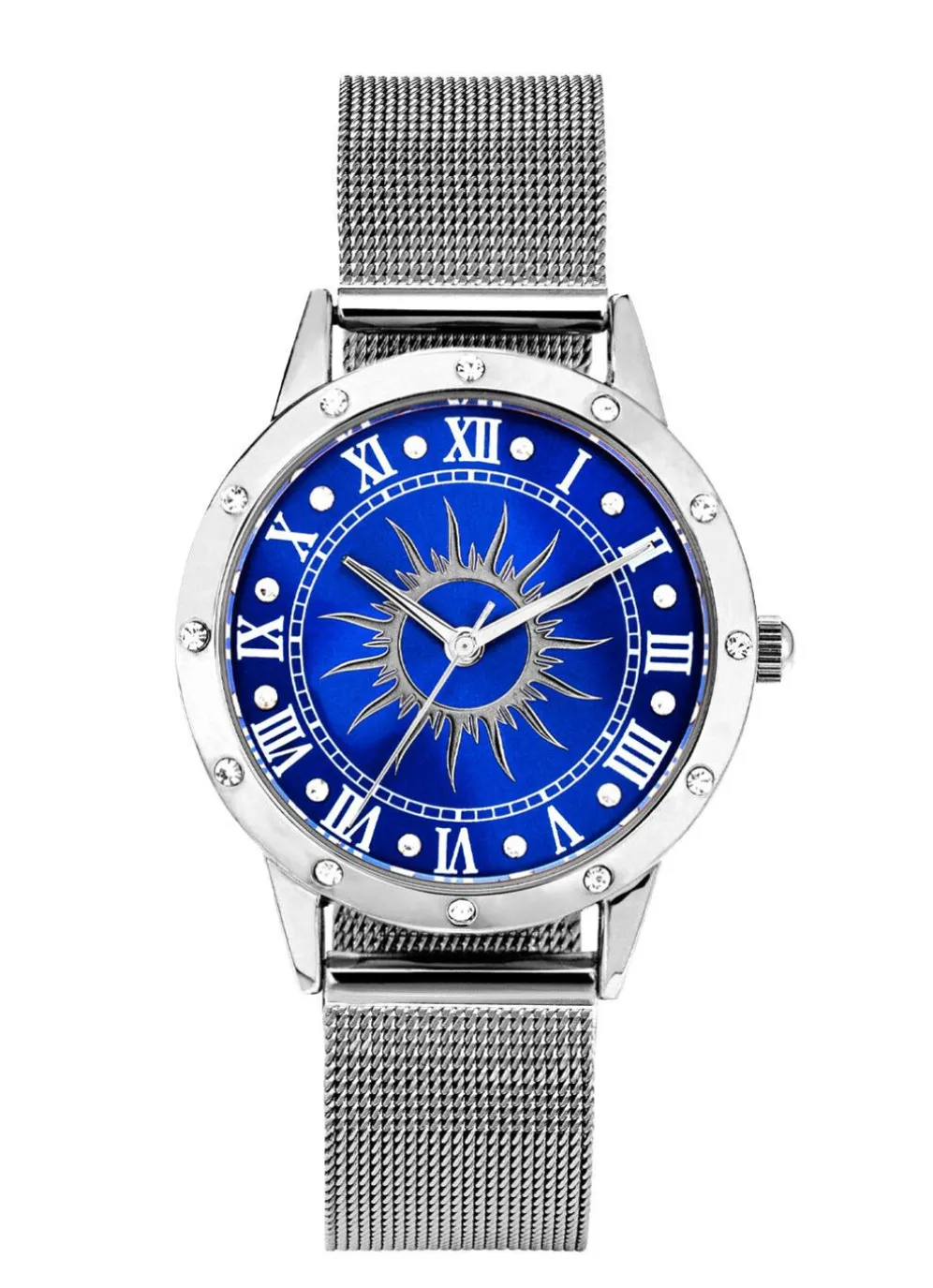 Silberfarbene Damenuhr mit Sonnenmotiv und Kristallakzenten