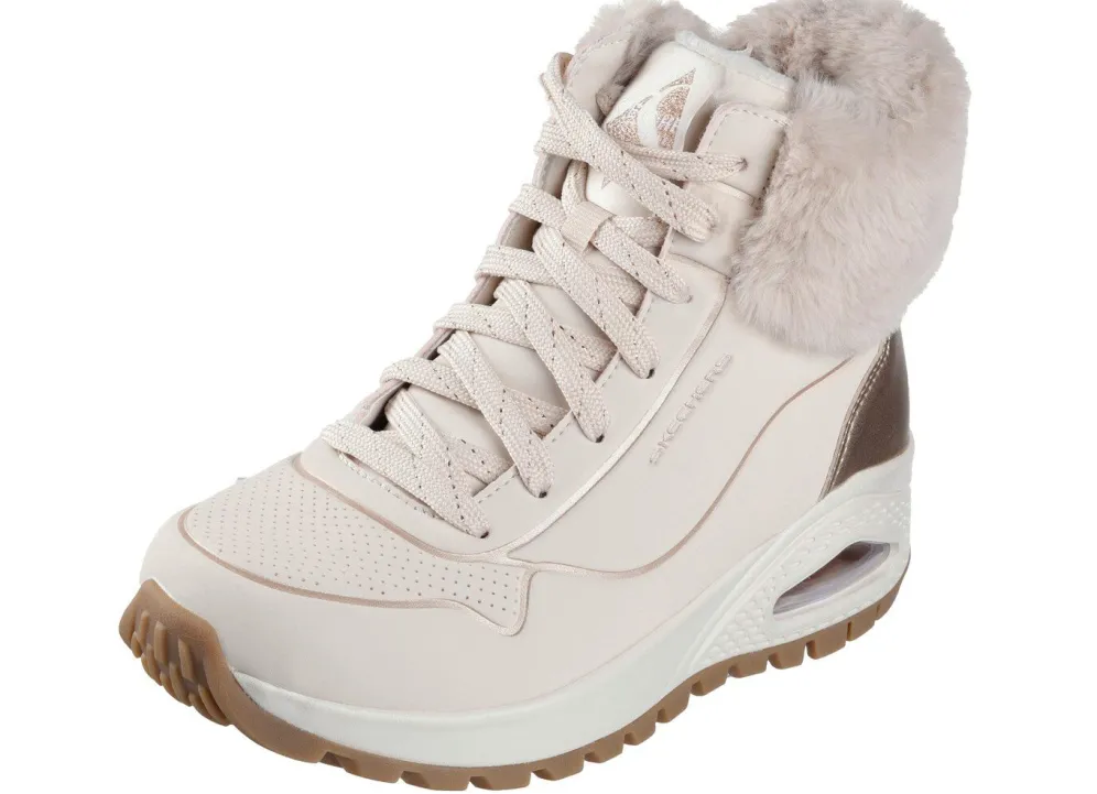 Boots aus Synthetik mit flauschigem Plüschkragen: Schnürung, seitlicher Reißverschluss, Textilfutter, gepolsterte Decksohle, Gummi-Profilsohle mit sichtbarem Luftpolster sowie 20 mm Keilabsatz. Schafthöhe ca. 10 cm