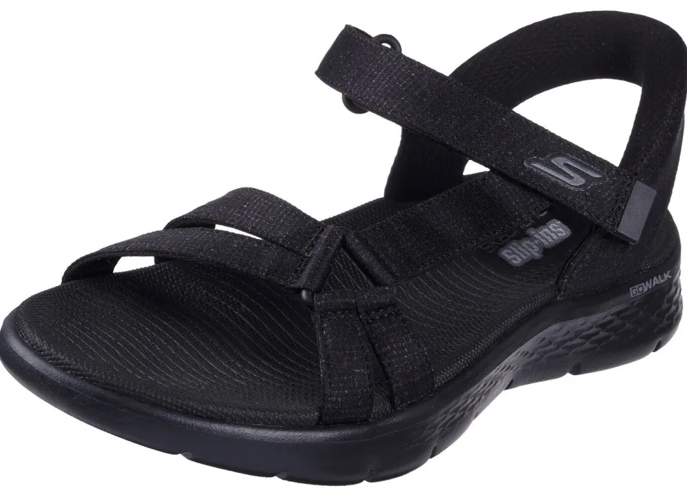 Sandalen aus meliertem Textilmaterial, mit geformter Slip-Ins Fersenplatte für ein einfaches Anziehen. Verstellbare Klettspange, Textilfutter, Fußbett, leichte EVA-Profilsohle sowie 10 mm Keilabsatz