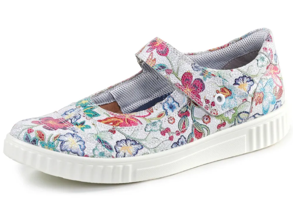 Slipper in Ecru-Bunt aus floral bedrucktem Leder, mit verstellbarer Klettspange: Weite H, verdeckter Gummizug, Textilfutter, herausnehmbares Fußbett, leichte PUR-Laufsohle sowie 10 mm Keilabsatz