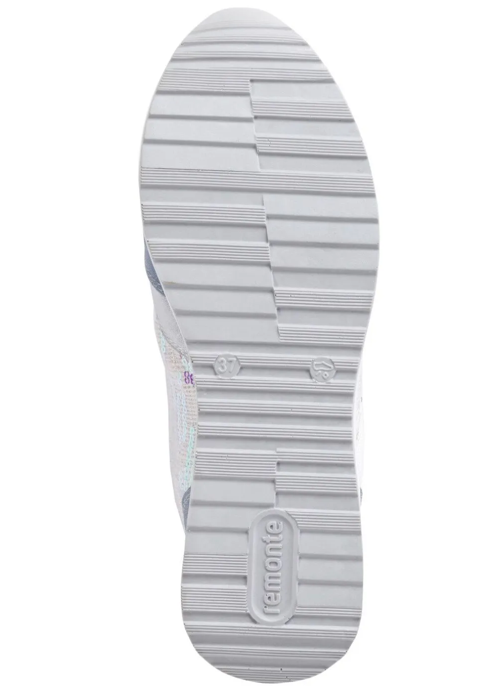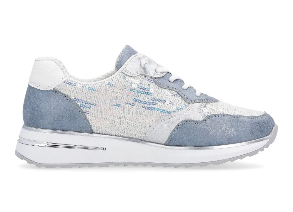 Sneaker in Bleu-Weiß aus interessant geprägtem Materialmix, teilweise mit schimmernden Pailletten besetzt: Schnürung, Textilfutter, herausnehmbares Fußbett, leichte TR-Profilsohle sowie 20 mm Keilabsatz