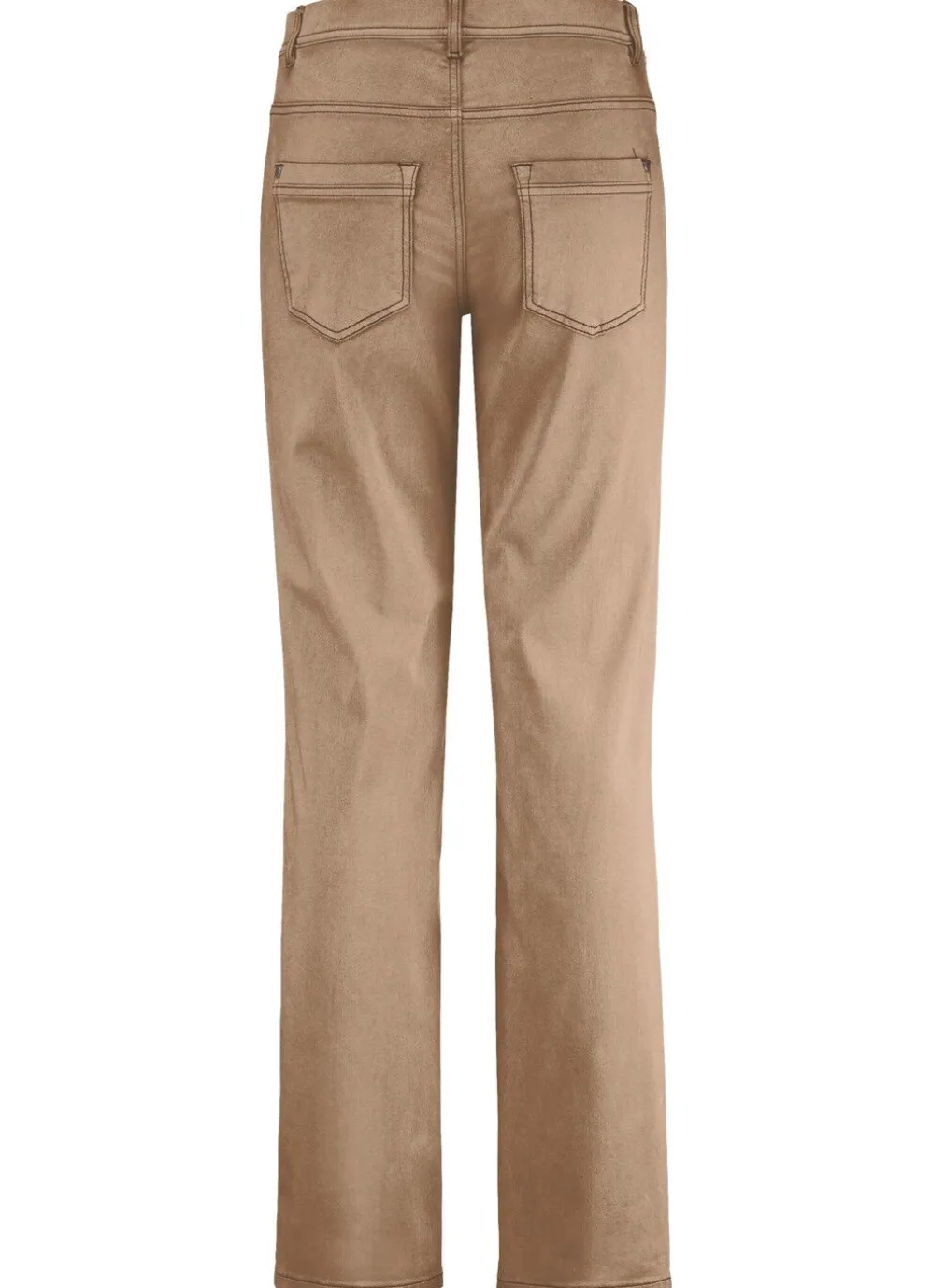 Tragangenehme, softe Hose in 5-Pocket-Form: gerader Beinverlauf, elastischer Formbund mit eingearbeiteter Gummibund-Einlage im Rückteil, Gürtelschlaufen, Knopf- und Reißverschluss sowie figurformde Passe im Rückteil. Innenbeinlänge ca. 79 cm, Fußweite ab 38 cm.
