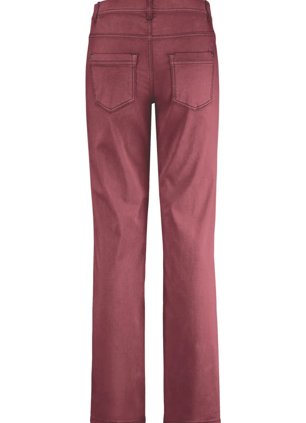 Tragangenehme, softe Hose in 5-Pocket-Form: gerader Beinverlauf, elastischer Formbund mit eingearbeiteter Gummibund-Einlage im Rückteil, Gürtelschlaufen, Knopf- und Reißverschluss sowie figurformde Passe im Rückteil. Innenbeinlänge ca. 79 cm, Fußweite ab 38 cm.