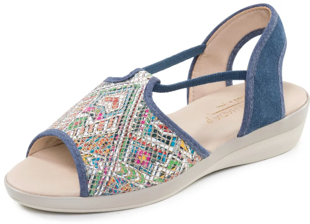 Sandalen aus verspielt bedrucktem Synthetik und Veloursleder, mit Elastikbändchen: Weite G, Futter, gepolsterte Decksohle, leichte PU-Laufsohle sowie 20 mm Keilabsatz
