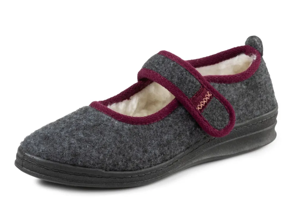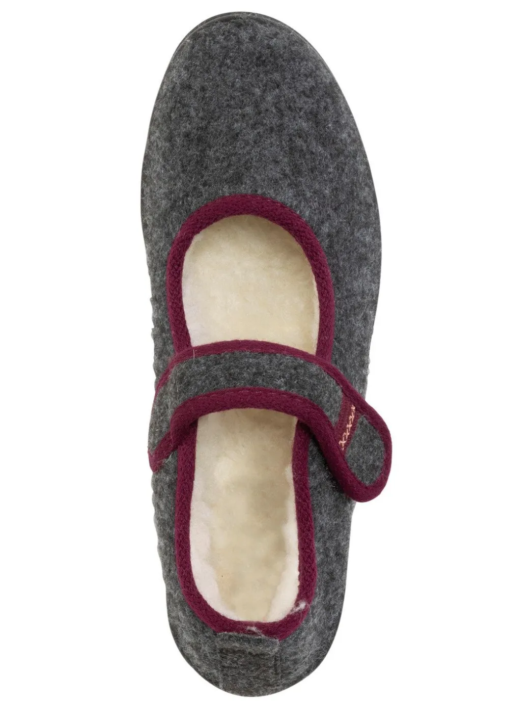 Spangenschuh aus weichem Filz, mit Klettverschluss: molliges Futter und Decksohlenbezug aus reiner Schurwolle, leichte PVC-Riffelsohle sowie 15 mm Keilabsatz