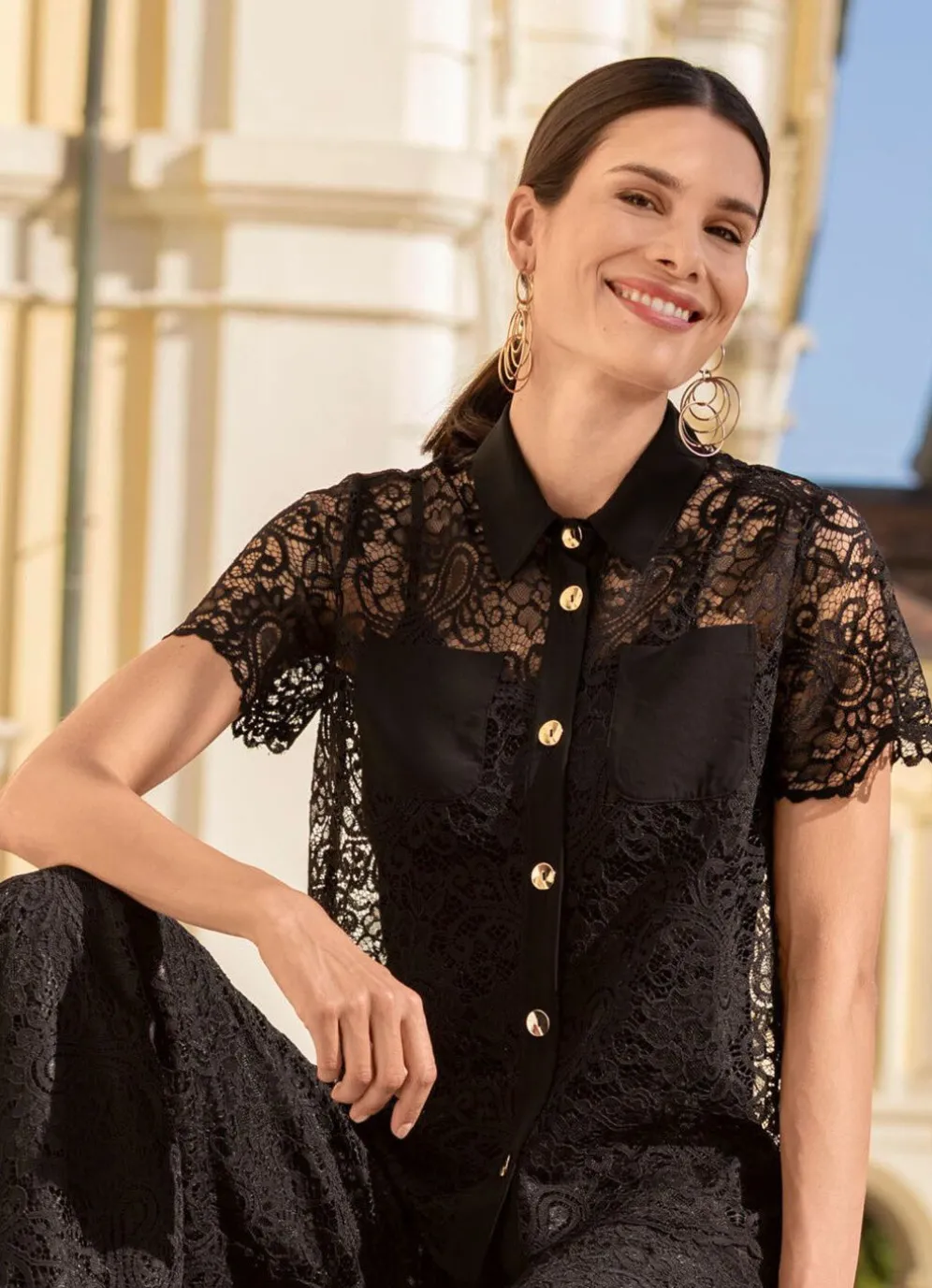 Feminine Spitzenbluse in Schwarz von laurakent, mit Hemdkragen, goldfarbenen Schmuckknöpfen an der Knopfleiste, zwei aufgesetzten Brusttaschen, kurzen Ärmeln sowie gebogtem Saum rundum.