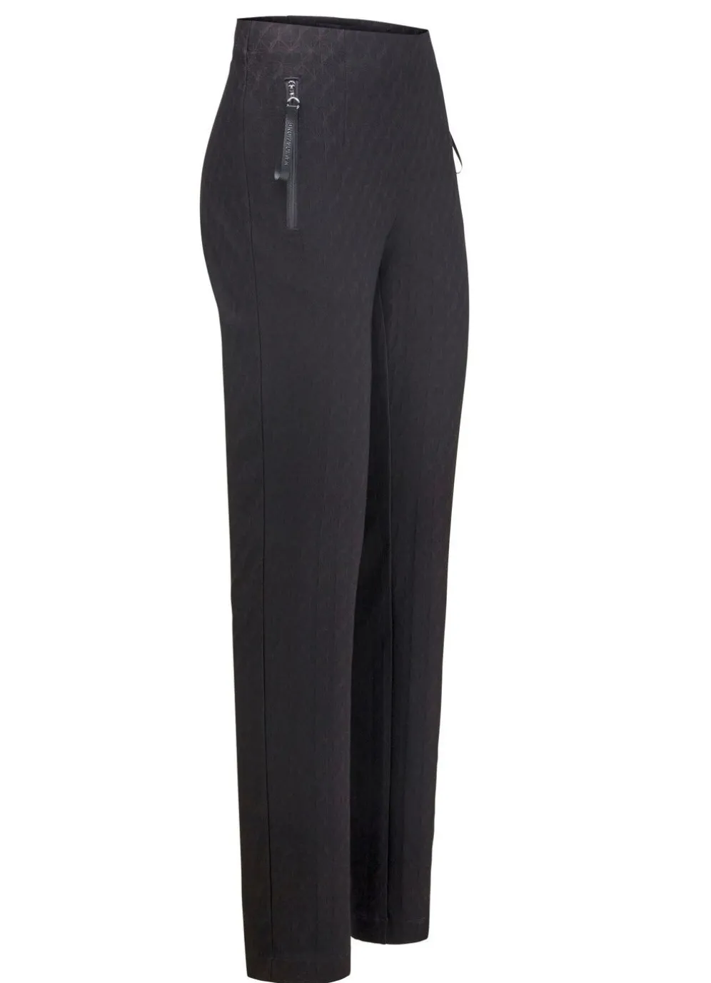 Sportive Hose in Schwarz, mit angeschnittenem Bund, glatt anliegend dank der innenliegenden Gummibund-Einlage, figurformende Abnäher unterhalb des Bundes rundum sowie Seitentaschen mit Reißverschluss und Zieranhänger. Innenbeinlänge ca. 78 cm, Fußweite ab 36 cm.